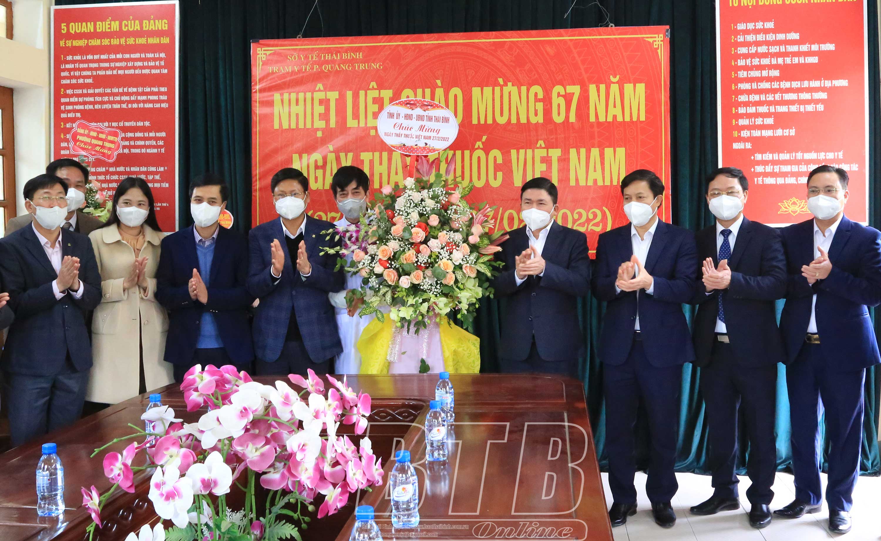 Các đồng chí: Phạm Văn Tuân, Ủy viên Ban Thường vụ, Trưởng ban Tổ chức Tỉnh ủy; Lại Văn Hoàn, Tỉnh ủy viên, Phó Chủ tịch UBND tỉnh chúc mừng cán bộ, nhân viên Trạm Y tế phường Quang Trung, thành phố Thái Bình.
