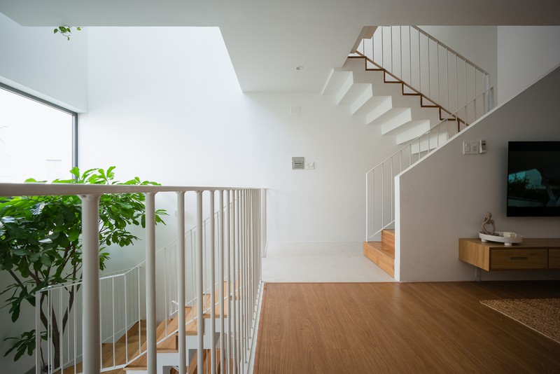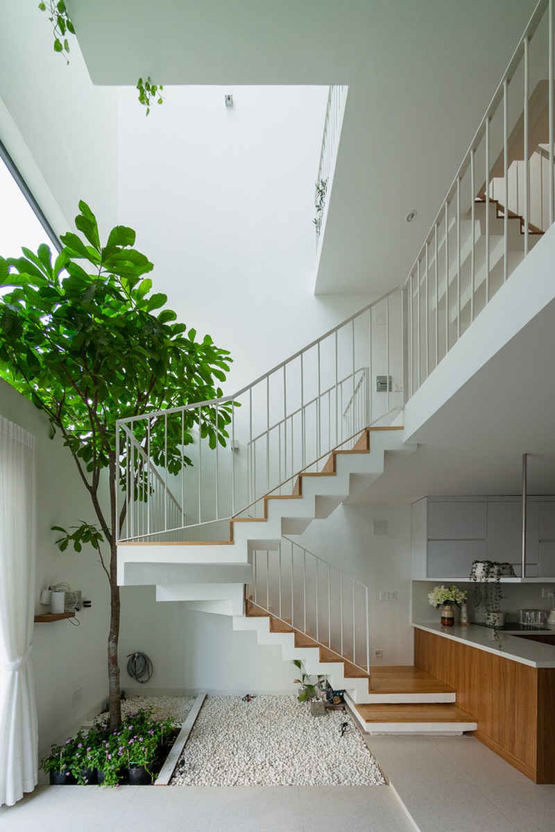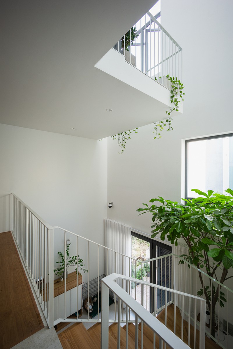 Vị trí cầu thang của ngôi nhà liên tục thay đổi, nằm ở giữa tâm nhĩ với sự xuất hiện của cây xanh, ánh sáng nhằm kích thích các hoạt động và quan sát chiều dọc của ngôi nhà.