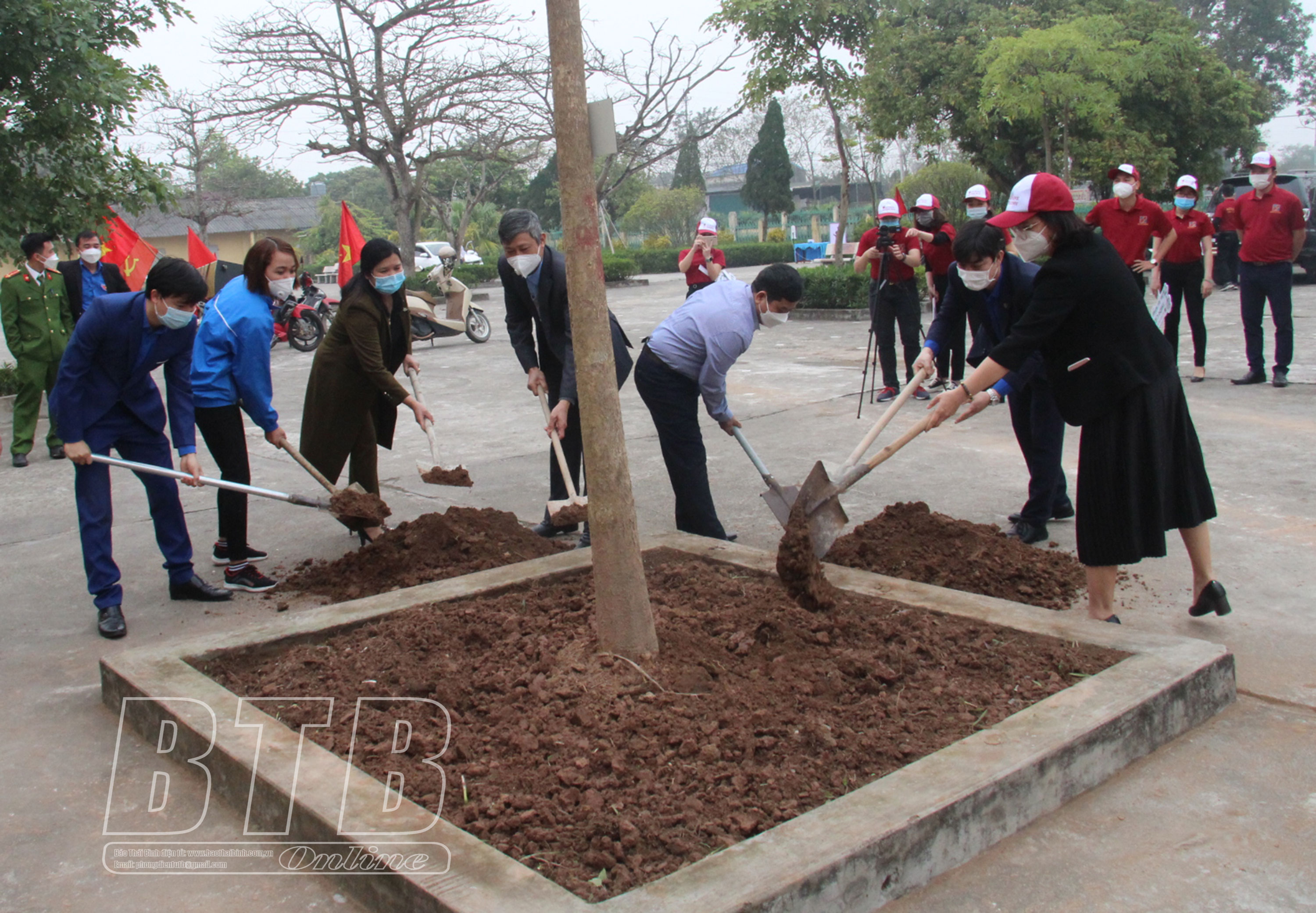 Các đại biểu và đoàn viên, thanh niên trồng cây tại Trường Tiểu học xã Thống Nhất, huyện Hưng Hà.