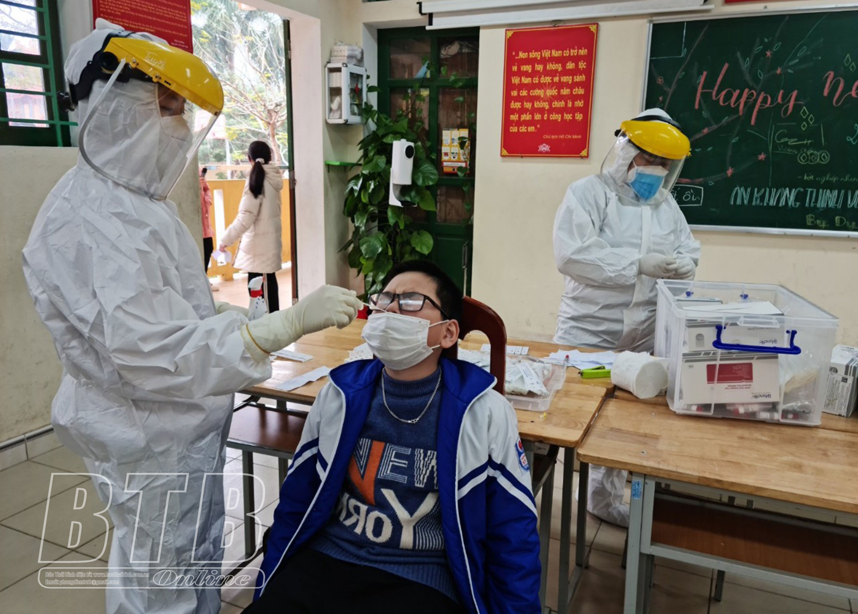 Nhân viên y tế tổ chức lấy mẫu test nhanh Covid-19 cho học sinh.