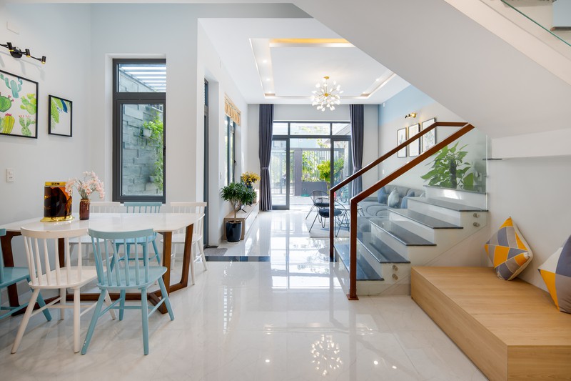 Đây cũng là chỗ cung cấp ánh sáng cho bếp và bàn ăn mà không cần giếng trời. Kiến trúc sư Nguyên Tương chia sẻ, đối với điều kiện khí hậu ở miền Trung, giếng trời chiếu xuống sẽ khá nóng và thường bị sự cố thấm giọt vào những mùa mưa bão khó xử lý.