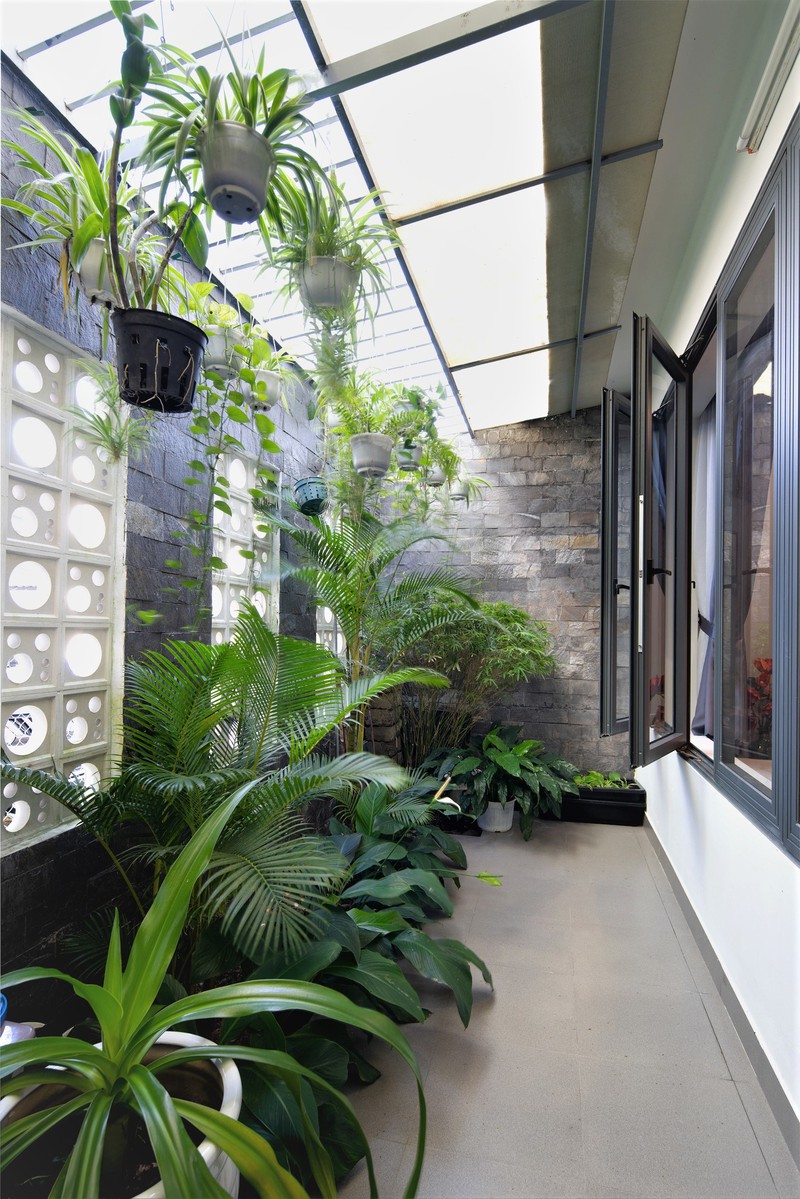 Phần sân sau 2m để cung cấp view và khí tươi cho phòng ngủ chính. Lồng ghép khéo léo giữa không gian ở và các không gian xanh, các không gian xanh có vai trò đối lưu gió và cung cấp ánh sáng tự nhiên và năng lượng cho toàn bộ công trình.