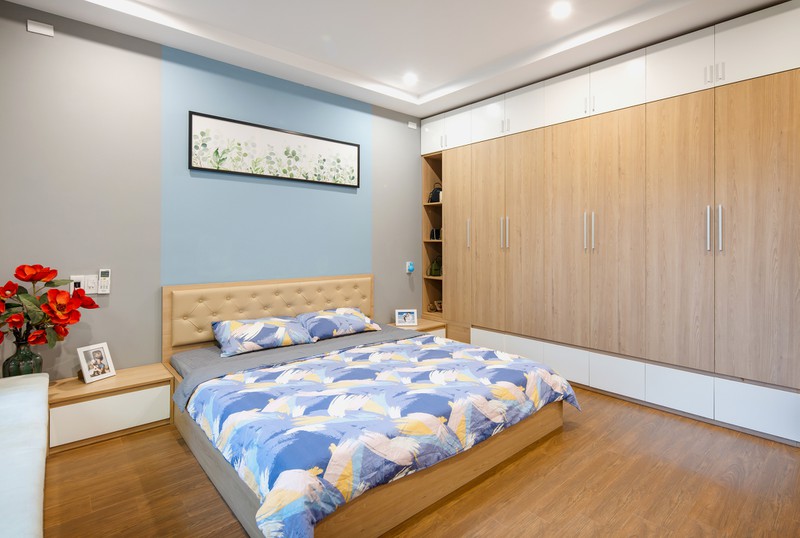 Phòng ngủ lắp đặt tủ âm, cao kịch trần, giúp không gian rộng rãi hơn.