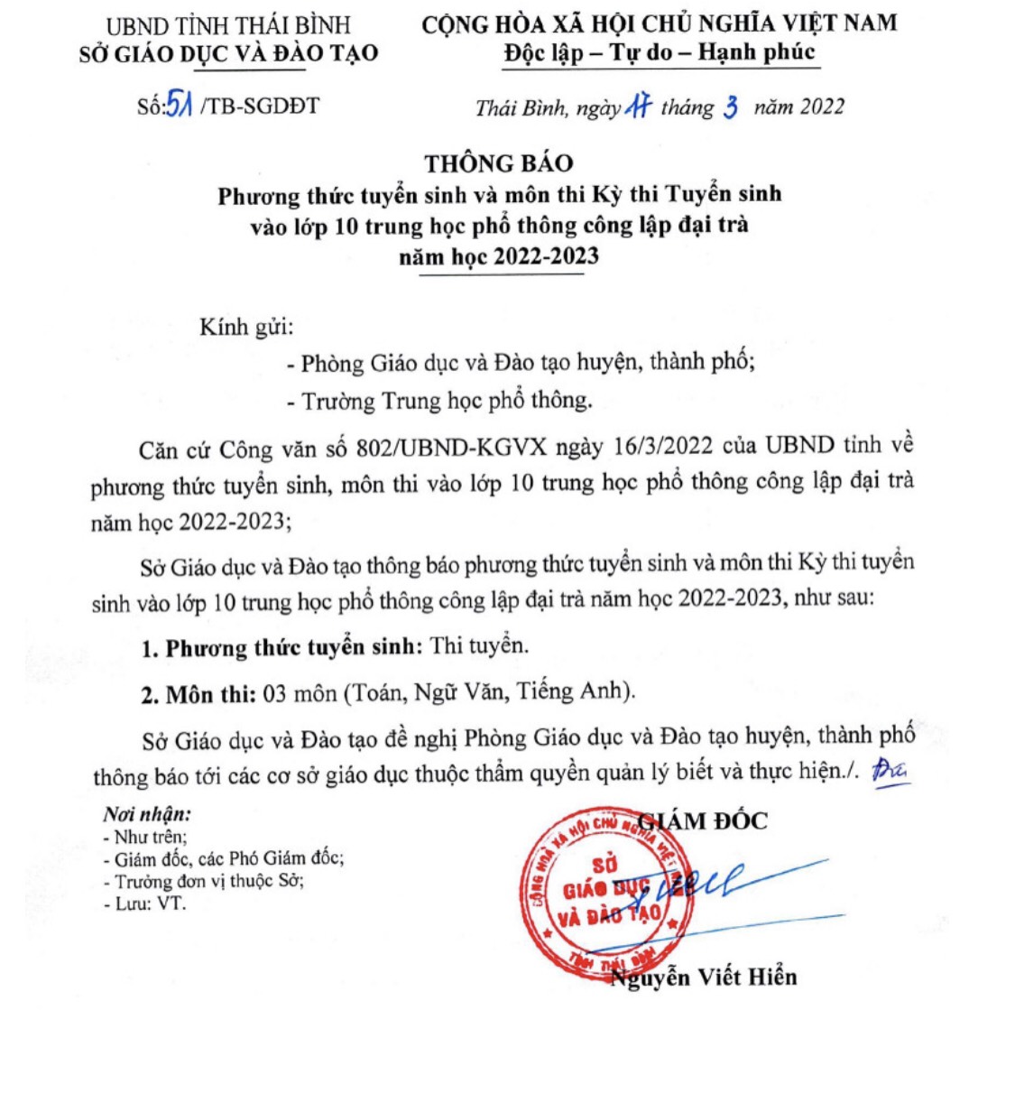 Ngày 17/3, Sở Giáo dục và Đào tạo ban hành Thông báo số 51/TB-SGDDT thông báo phương thức tuyển sinh và môn thi kỳ thi tuyển sinh vào lớp 10 THPT công lập đại trà năm học 2022-2023.