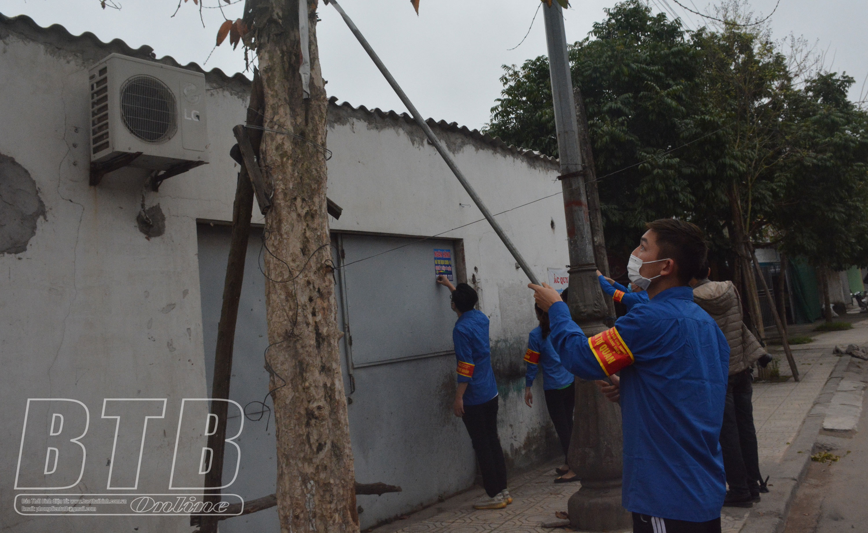 Đoàn viên, thanh niên bóc dỡ quảng cáo, rao vặt trái phép tại phường Hoàng Diệu (thành phố Thái Bình).