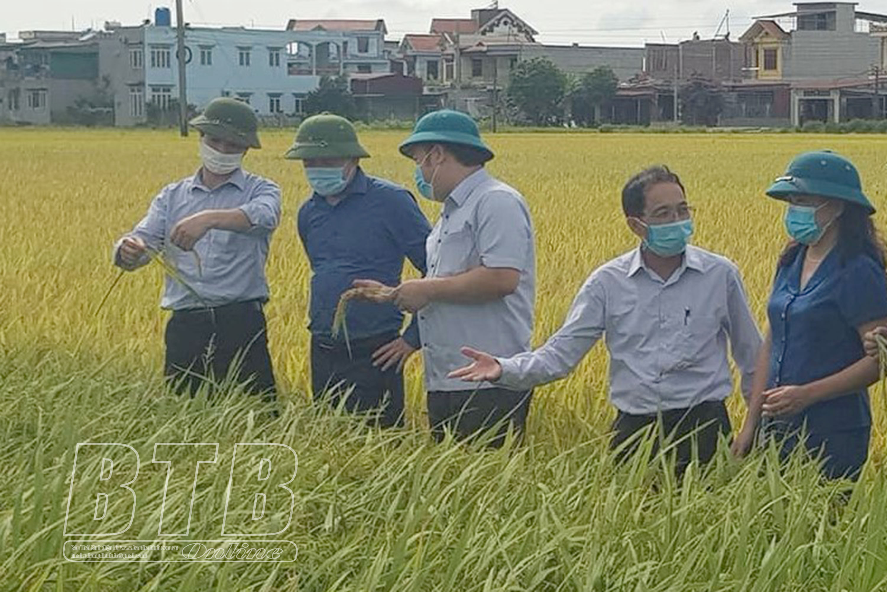 Lãnh đạo Cục Thống kê tỉnh cùng lãnh đạo Sở Nông nghiệp và Phát triển nông thôn đi thăm đồng, đánh giá năng suất vụ xuân năm 2021 ở huyện Đông Hưng.