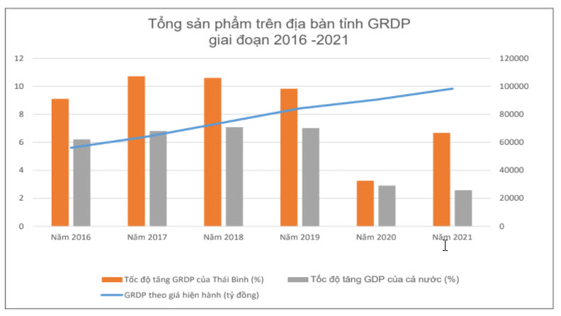 Tạo sức bật bằng những hành động cụ thể, kinh tế của tỉnh ngày càng tăng trưởng và phát triển qua các năm. Xuất phát điểm từ một tỉnh nông nghiệp với nền kinh tế thấp nhưng đến năm 1966 Thái Bình đã trở thành tỉnh đầu tiên của miền Bắc đạt năng suất 5 tấn thóc/ha. Thực hiện 5 trọng tâm phát triển kinh tế được đề ra từ Đại hội Đảng bộ tỉnh lần thứ XVI, tỉnh tập trung quy hoạch và xây dựng được các khu, cụm công nghiệp, đẩy mạnh phát triển nghề và làng nghề, chuyển đổi cơ cấu cây trồng, vật nuôi trong nông nghiệp, hình thành một số vùng sản xuất hàng hóa và phát triển kinh tế biển; chính vì thế, nền kinh tế của tỉnh đã thoát khỏi tình trạng trì trệ, duy trì được tốc độ tăng trưởng khá, tổng sản phẩm quốc nội bình quân tăng 7,2%/năm. Giai đoạn 2016 - 2020, mặc dù còn gặp nhiều khó khăn, thách thức đặc biệt là tác động của dịch Covid-19 nhưng kinh tế của tỉnh vẫn tăng trưởng khá với tổng sản phẩm trên địa bàn GRDP bình quân ước tăng 9%/năm, vượt 0,4% so với mục tiêu đề ra, cao hơn mức trung bình cả nước và gấp 1,3 lần mức tăng trưởng của 5 năm trước. Đặc biệt, năm 2021 - năm đầu tiên triển khai thực hiện Nghị quyết Đại hội đại biểu Đảng bộ tỉnh lần thứ XX, những diễn biến rất phức tạp của dịch Covid-19 đã tác động đến phát triển kinh tế - xã hội của tỉnh nhưng nhờ thực hiện thành công mục tiêu kép, GRDP của tỉnh vẫn tăng trưởng khá cao, đứng thứ 14/63 tỉnh, thành phố với mức tăng 6,68%. Nhiều chỉ tiêu tăng trưởng khá cao, trong đó phải kể đến đó là lĩnh vực công nghiệp với mức tăng 17% so với năm 2020, kim ngạch xuất khẩu tăng 23,5% so với năm 2020, kim ngạch nhập khẩu tăng 21,3% so với năm 2020, vượt 11,6% so với kế hoạch đề ra, tỷ lệ giải ngân vốn đầu tư công dẫn đầu cả nước, tổng thu ngân sách nhà nước vượt 50,4% dự toán, tổng thu ngân sách địa phương vượt 49,2% dự toán, trong đó thu nội địa vượt 54,7% dự toán và là năm đầu tiên đạt trên 10.000 tỷ đồng với tổng thu đạt hơn 10.534 tỷ đồng...