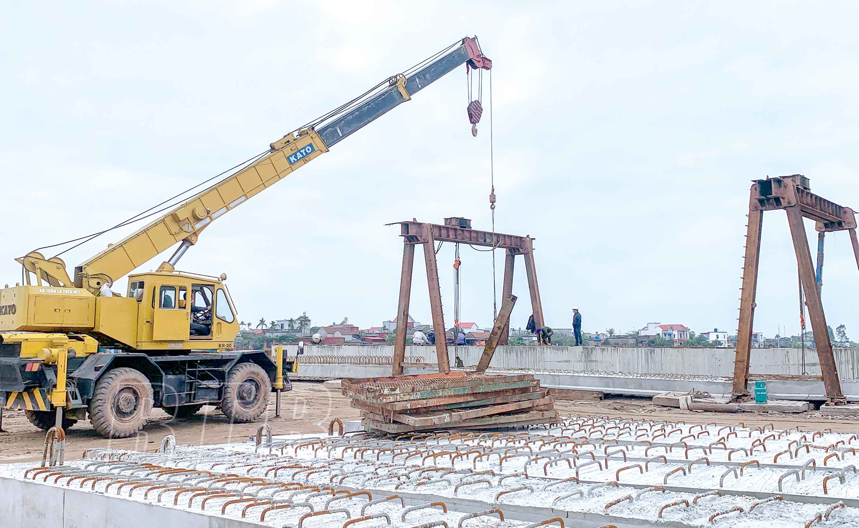 Thi công cầu Diêm Điền thuộc dự án đầu tư xây dựng tuyến đường bộ ven biển tỉnh Thái Bình. Ảnh: Nguyễn Thơi
