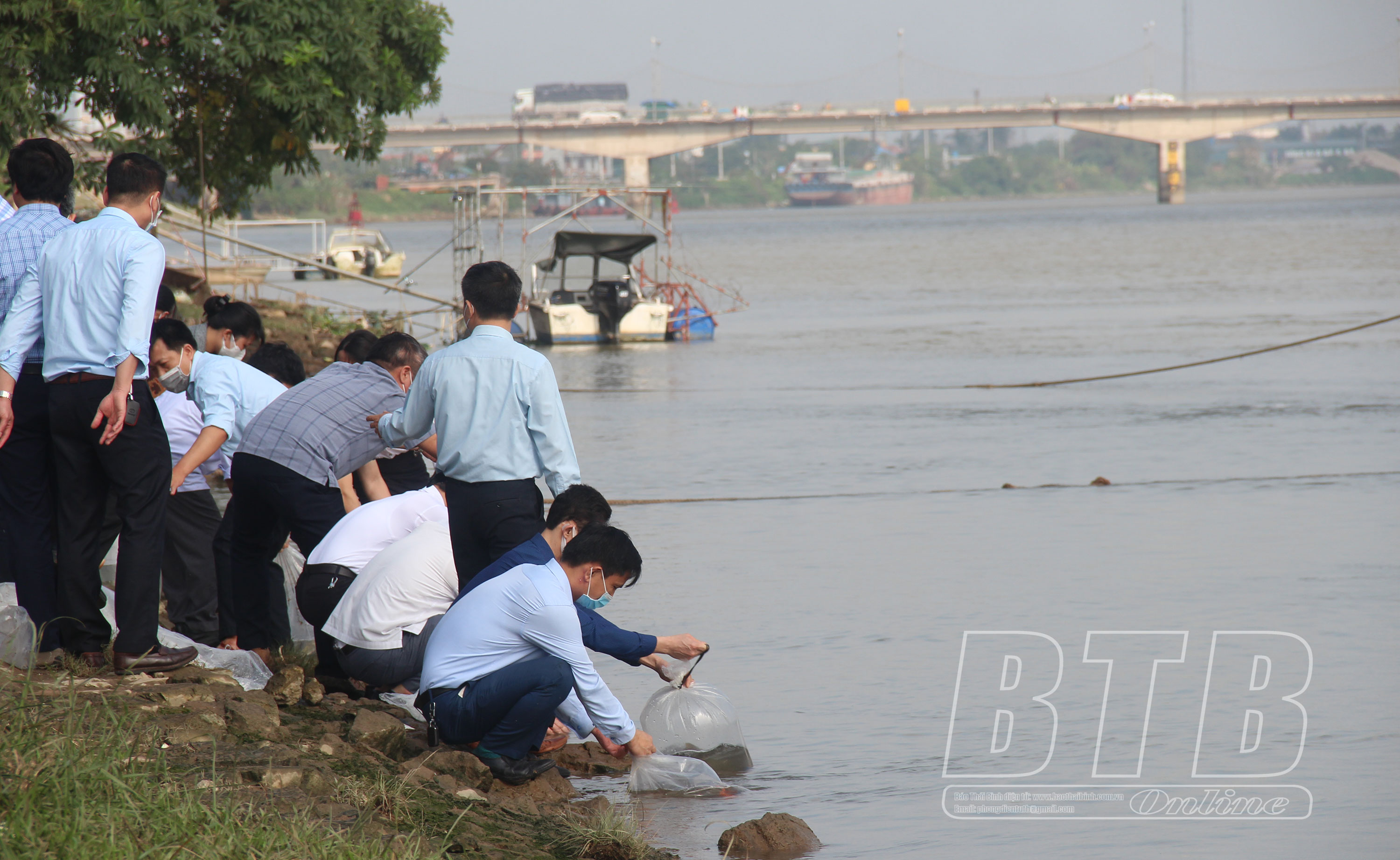 Các đại biểu thả cá trên sông Trà Lý.