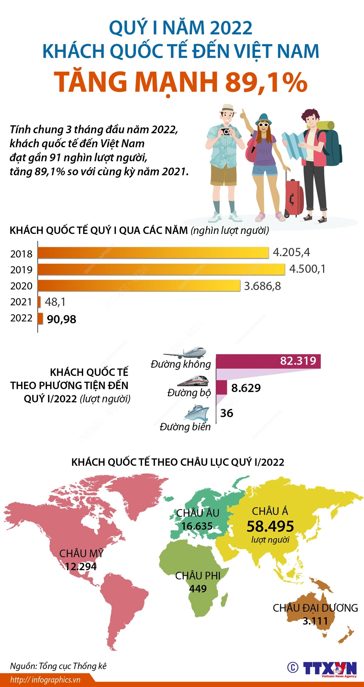 Quý I năm 2022: Khách quốc tế đến Việt Nam tăng mạnh 89,1%