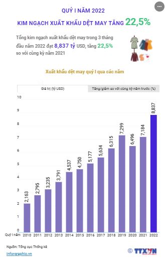 Tổng kim ngạch xuất khẩu dệt may trong 3 tháng đầu năm 2022 đạt 8.837 triệu USD, tăng 22,5% so với cùng kỳ năm 2021.