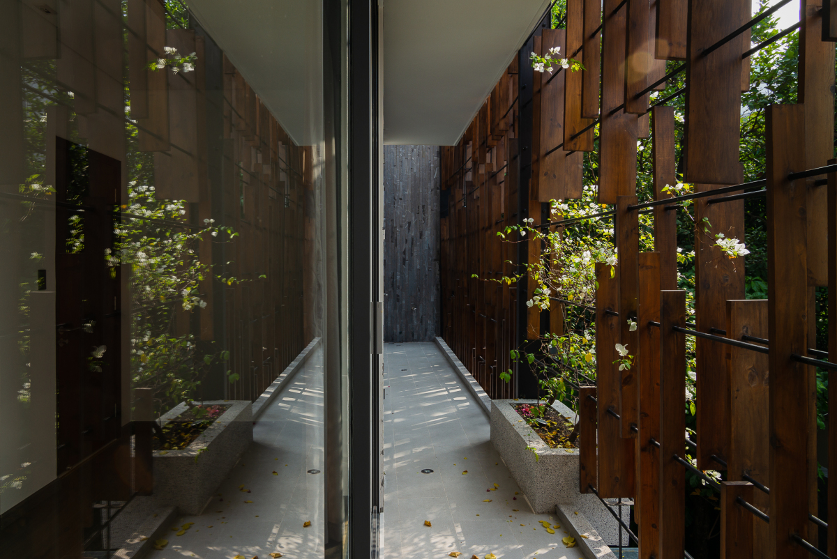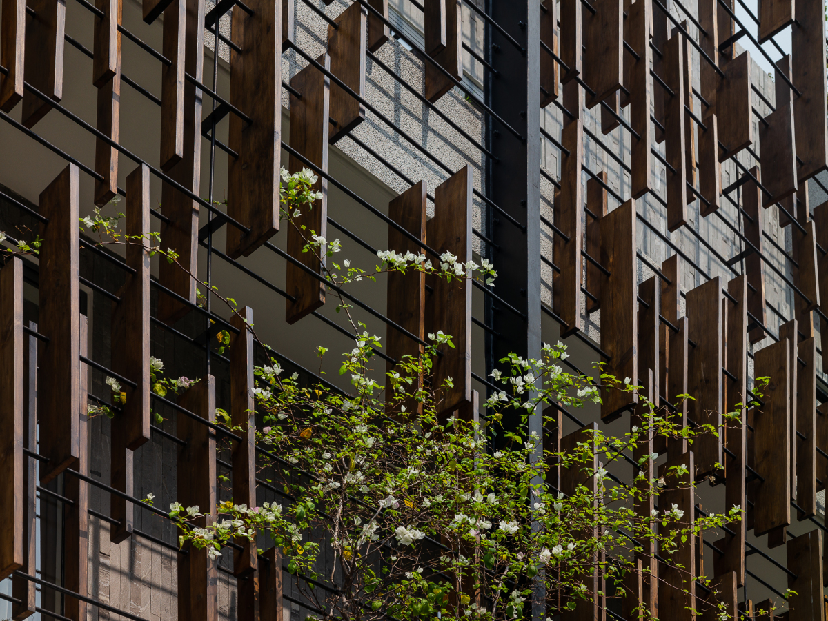 Tấm rèm bằng sắt và gỗ vừa che đi một phần cấu trúc cũ vừa chắn nắng cho căn nhà hướng Tây Nam. Nó cũng tạo nên hệ khung cho cây leo đồng thời đem tới hình thái kiến trúc mới mẻ, khác lạ.