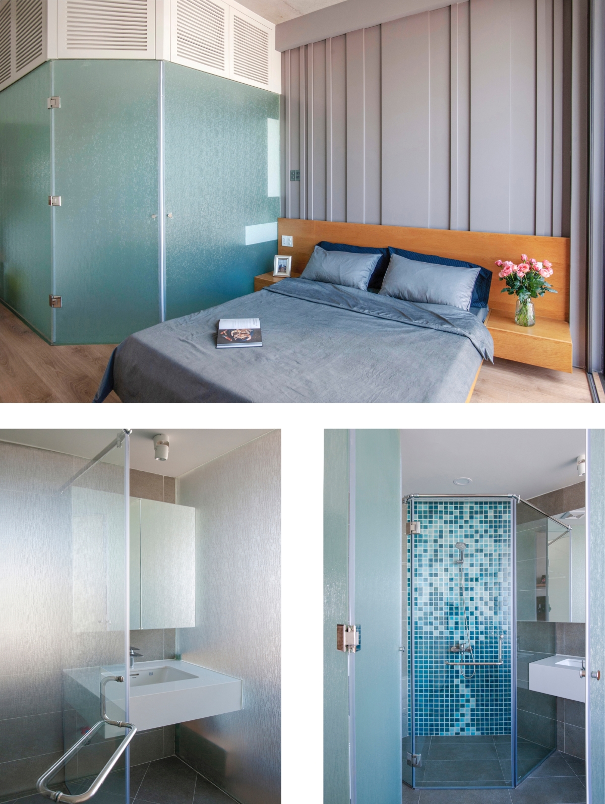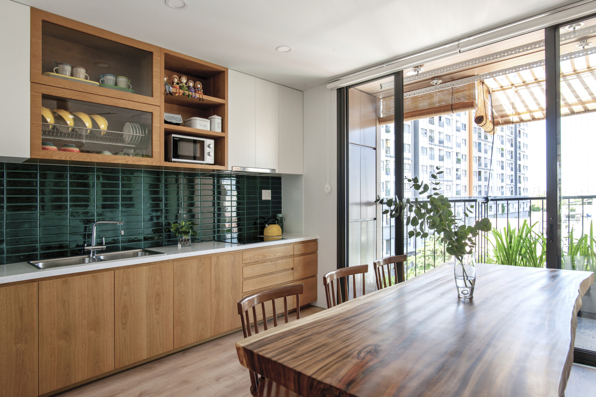 Về vật liệu, công trình sử dụng vách kính cho nhà tắm để tận dụng ánh sáng tự nhiên. Kết hợp với vách kính là các vật liệu thô mộc, tự nhiên như trần bê tông, sàn đá mài, gỗ.