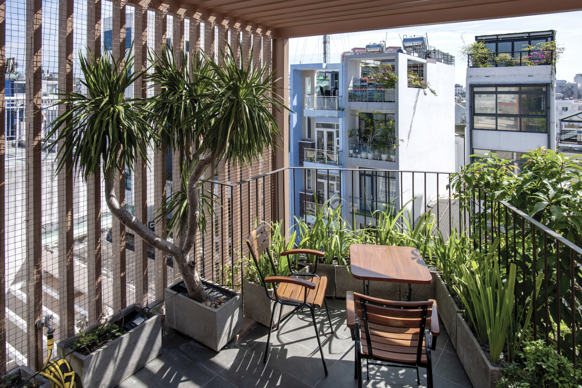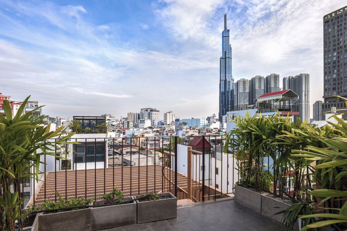 Khu vườn hai tầng tạo nên chỗ thư giãn đầy cây xanh cho gia chủ. Từ đây, họ cũng dễ dàng ngắm cảnh thành phố.