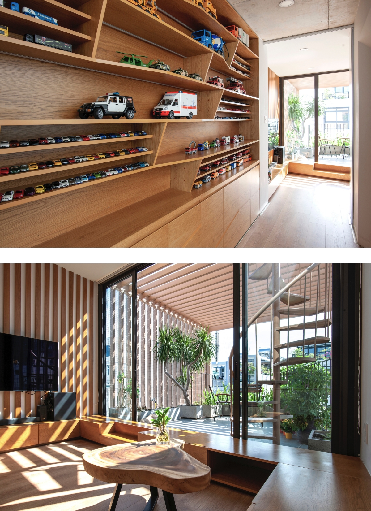 Phòng khách và bếp - phòng ăn thông nhau, ngăn cách bởi không gian trưng bày bộ sưu tập xe đồ chơi của gia chủ.