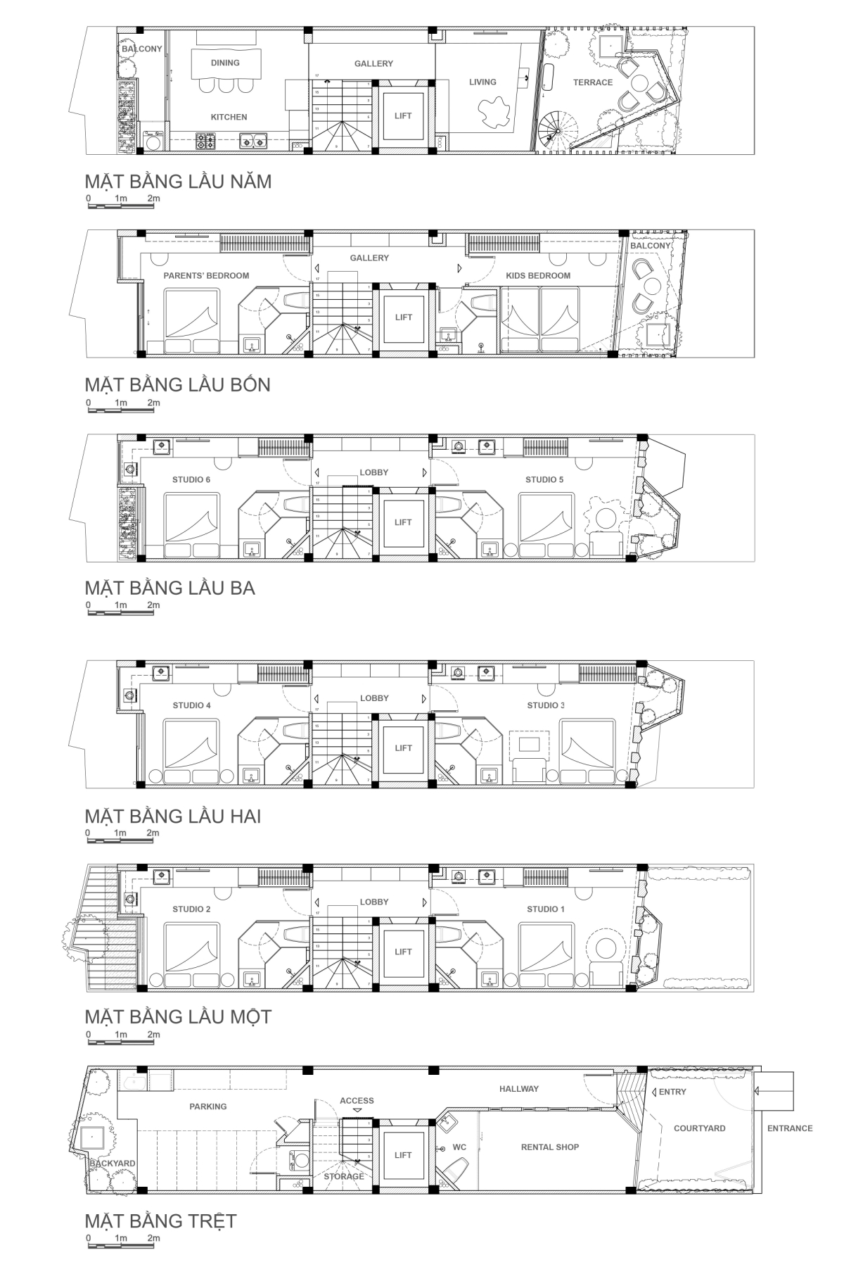 Hai tầng cao nhất là không gian sinh hoạt của gia đình chủ nhà.