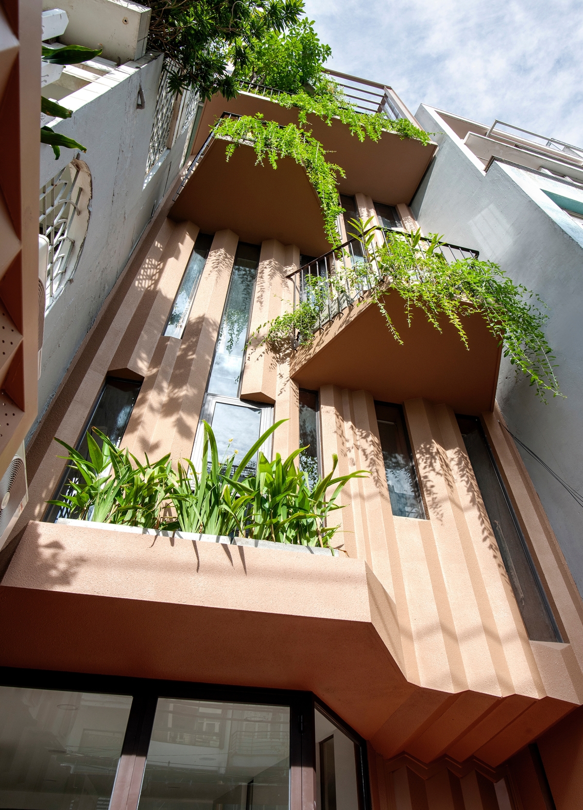 Mặt tiền với những mảng tường gấp xếp phủ sơn gai nhằm liên tưởng đến thân cây xù xì. Giải pháp này cũng giúp phản xạ âm thanh, giảm tiếng ồn từ con đường lớn vào nhà.