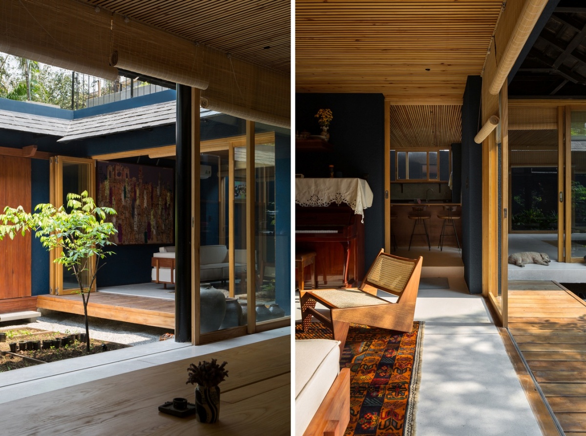 Không gian trong và ngoài ngăn cách nhau bằng hệ cửa kính cao chạm trần, cho phép người ở dễ dàng tiếp xúc với nắng, gió, mưa và cây xanh.