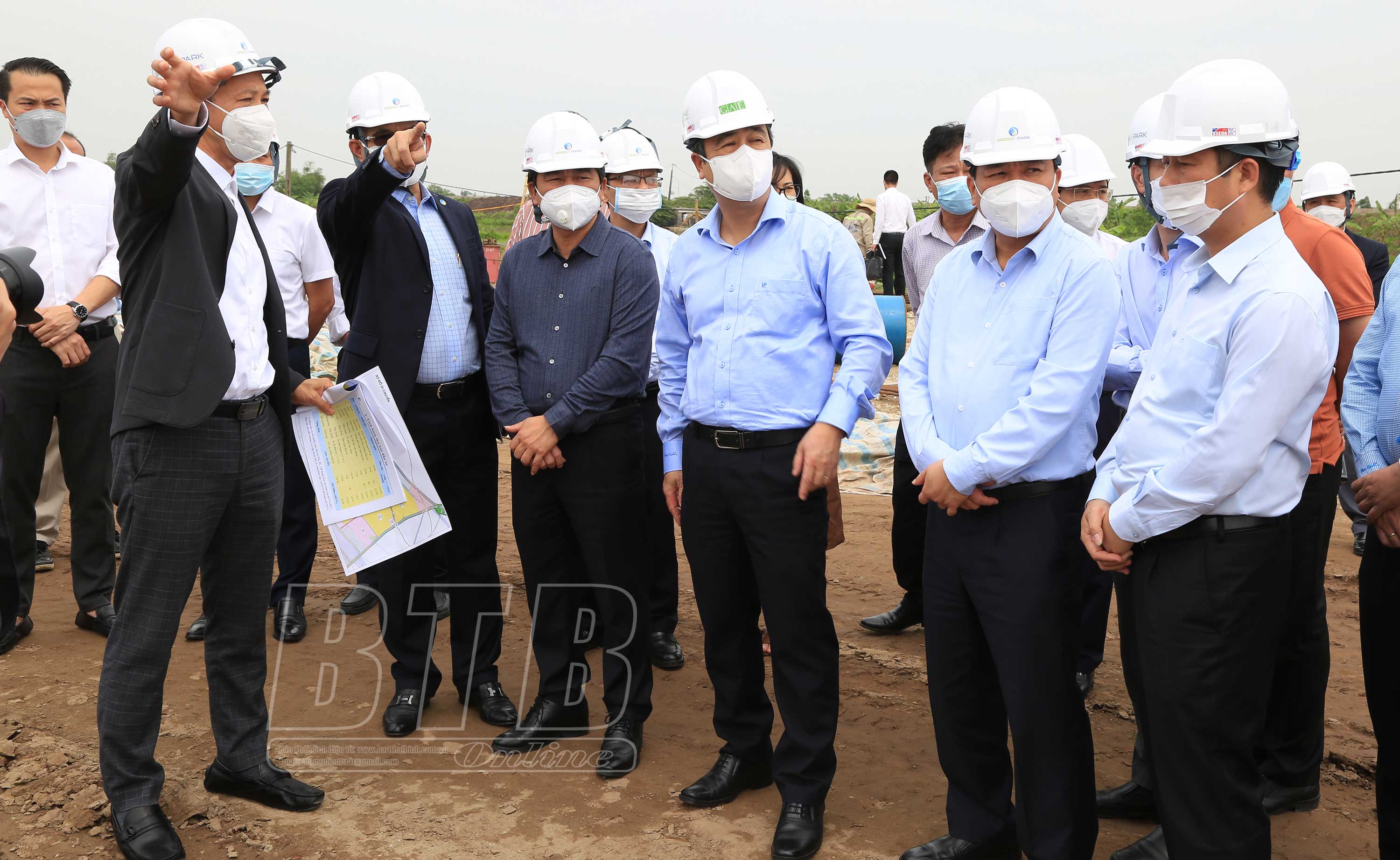 Các đồng chí lãnh đạo tỉnh kiểm tra tiến độ thi công các hạng mục công trình tại KCN Liên Hà Thái.