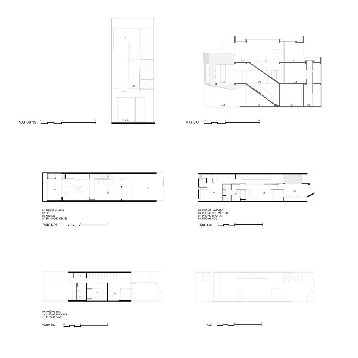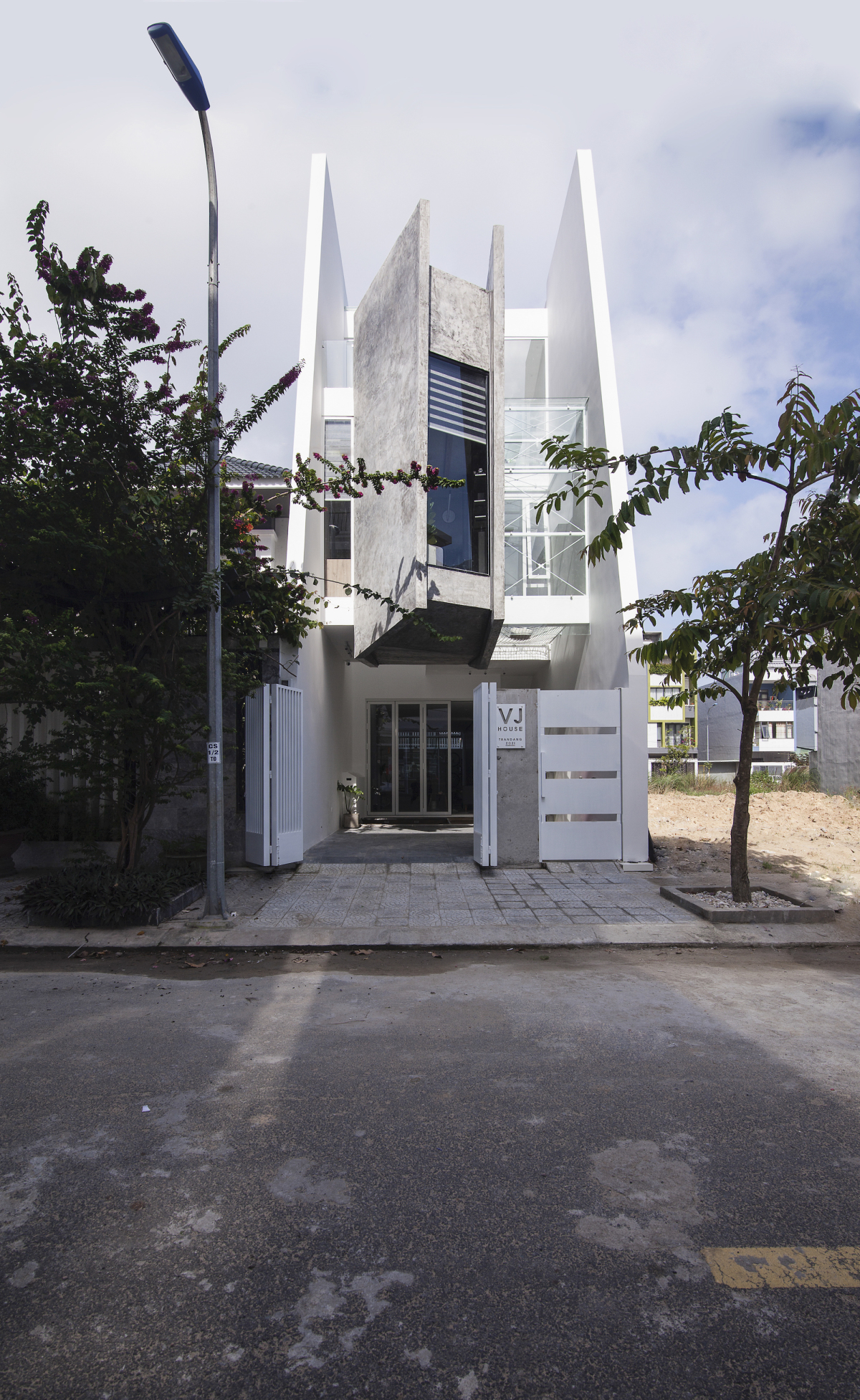 Đây là tổ ấm của một gia đình ba thế hệ. Chủ nhà trẻ, thích hình khối mạnh mẽ, muốn thể hiện cá tính qua căn nhà nên kiến trúc sư đưa ra thiết kế với những đường cắt chéo và một khối bê tông "lơ lửng" làm điểm nhấn ở mặt tiền.
