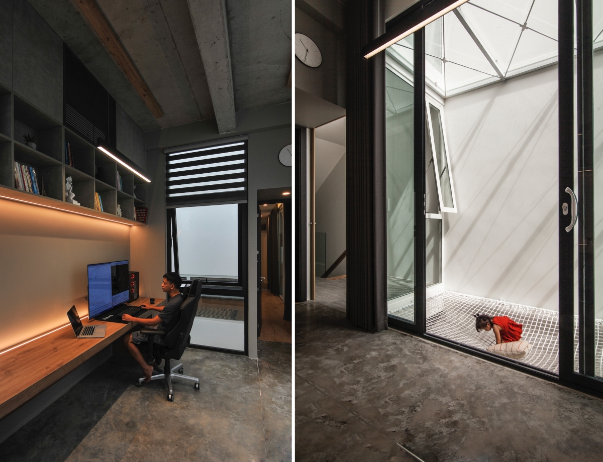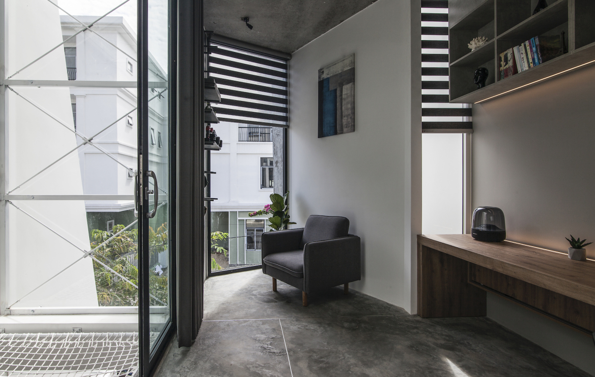 Cạnh phòng làm việc là giếng trời gắn lưới mắt cáo, vừa để tăng sự thông thoáng vừa để gia chủ làm IT dễ dàng thư giãn sau những giờ làm việc.