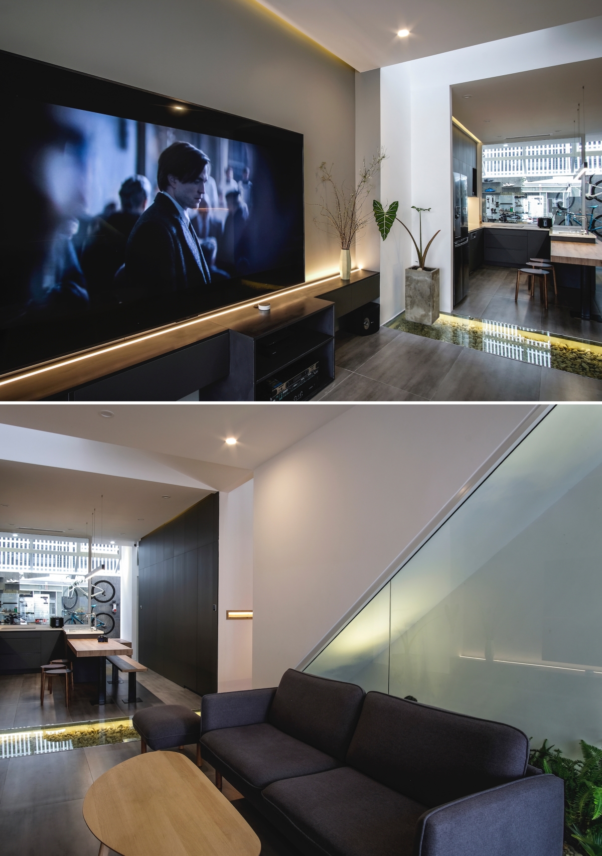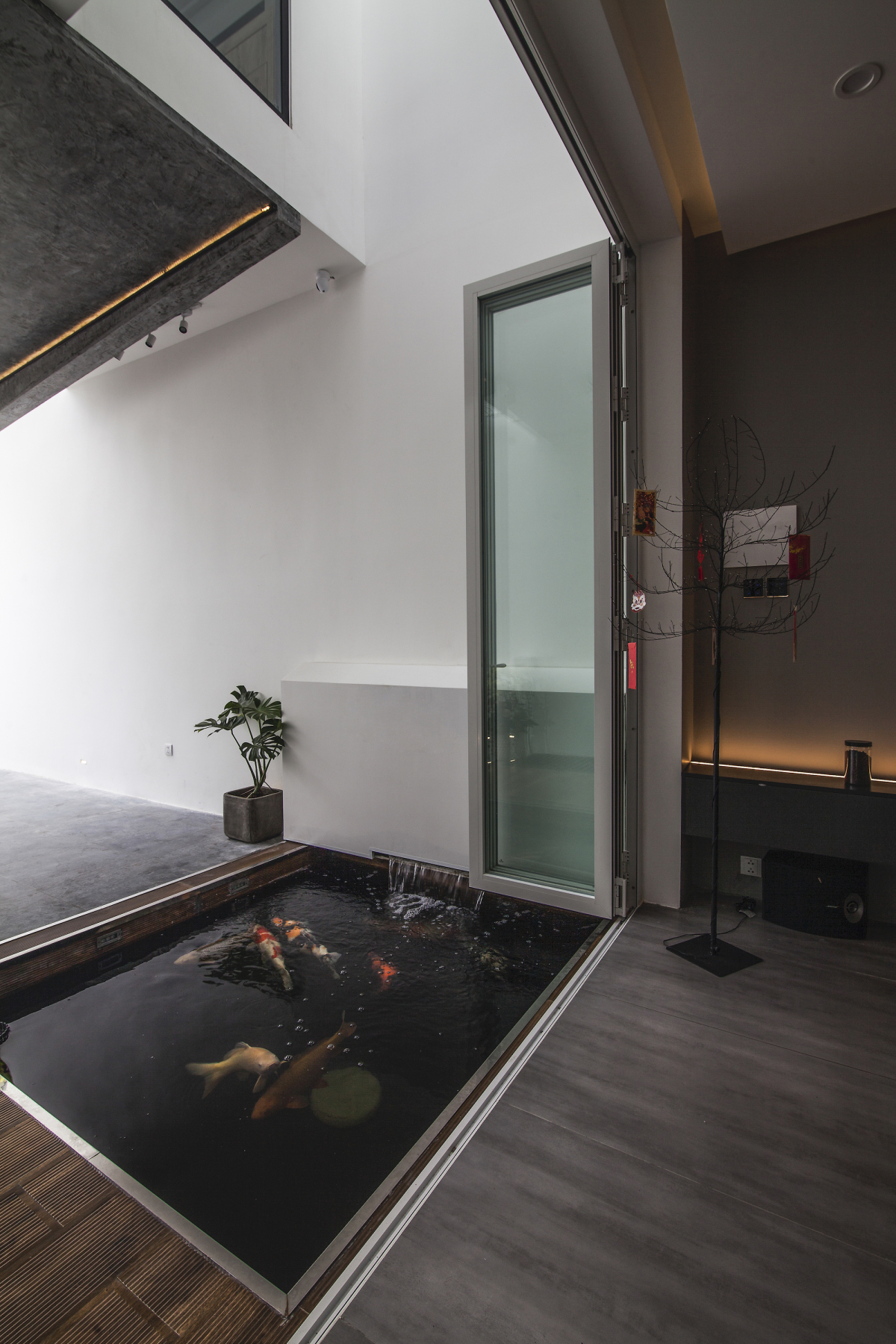 Các khu vực khác của ngôi nhà được thiết kế để gia chủ tận hưởng các thú vui của mình, vẫn đảm bảo sinh hoạt tiện nghi cho ba thành viên còn lại. Ví dụ, hồ nước ở lối vào tầng một tăng cường đối lưu, làm mát không khí vào nhà đồng thời thỏa mãn sở thích nuôi cá Koi của gia chủ.