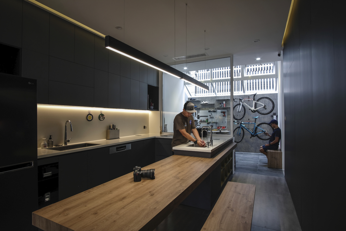 Khu vực sinh hoạt chung sử dụng tông xám đen, sử dụng các trang thiết bị hiện đại nhằm đáp ứng đam mê đồ công nghệ của chủ nhà. Cụ thể, đèn bếp điều khiển bằng ứng dụng và cảm ứng, ổ cắm điện âm trên mặt bàn chỉ xuất hiện khi ấn nút.