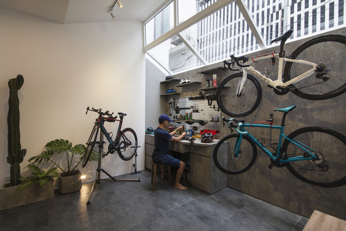 Cuối tầng một là studio nhỏ dành cho thú vui đạp xe của gia chủ. Ở đây, anh có thể bày xe cùng các dụng cụ liên quan.