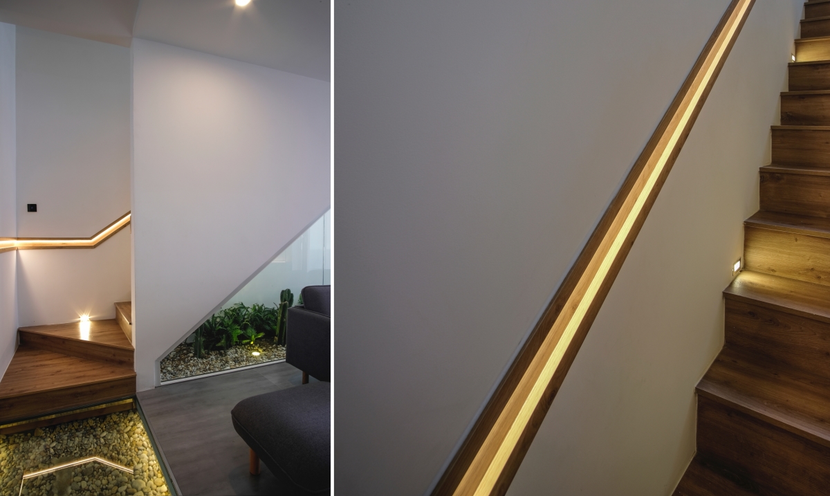 Công trình đề cao yếu tố hiện đại nên cầu thang được thiết kế phá cách với đèn vào khe lan can.