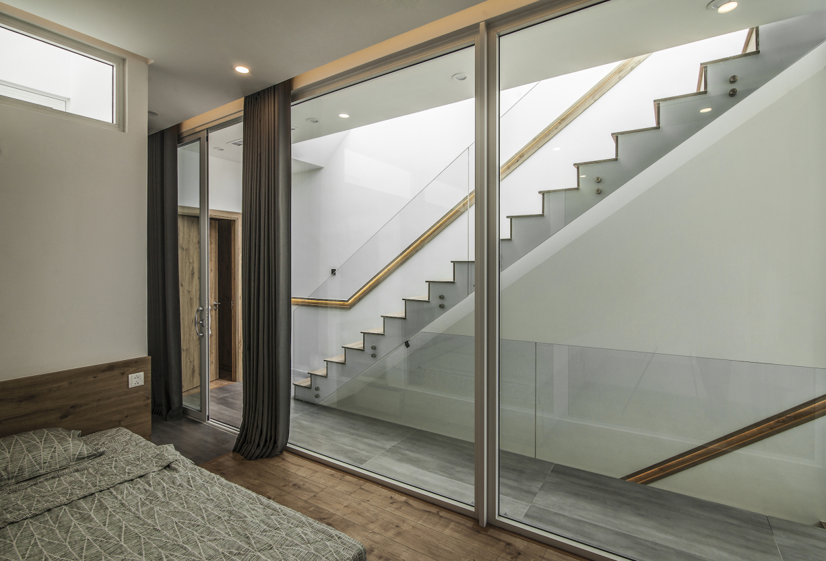 Nhờ hệ cửa kính và ô thông gió, không gian nghỉ ngơi ở các tầng trên được tiếp xúc với ánh sáng và gió tự nhiên qua nhiều mặt.