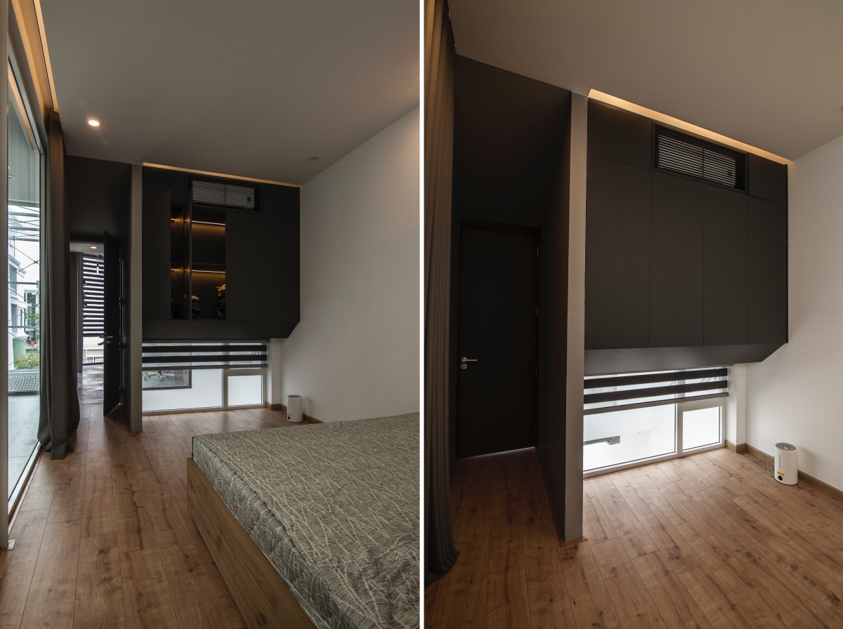 Qua màu sắc và hình khối, nội thất phòng ngủ một lần nữa nhắc lại yếu tố hiện đại và cá tính gia chủ. Công trình hoàn thành năm 2021 đem tới cho gia chủ tổ ấm đậm chất cá nhân như ý muốn của anh.