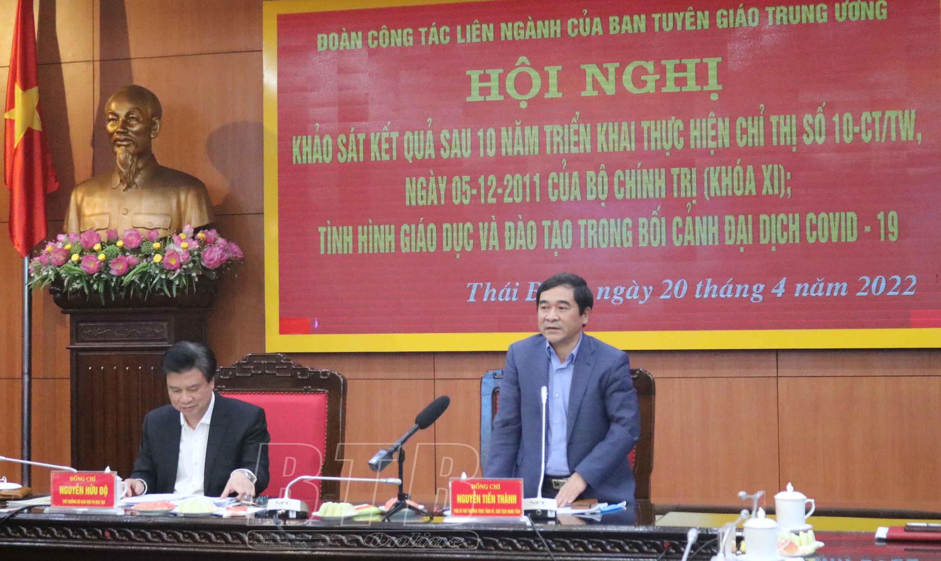 Phát biểu tại buổi làm việc, Thứ trưởng Bộ Giáo dục và Đào tạo Nguyễn Hữu Độ đánh giá cao việc thực hiện Chỉ thị số 10 của tỉnh Thái Bình, nhất là trong việc huy động sự vào cuộc của cả hệ thống chính trị, quá trình triển khai thực hiện nghiên túc, bài bản, khoa học. Để khắc phục một số tồn tại, hạn chế trong quá trình thực hiện, đồng chí đề nghị thời gian tới, tỉnh cần quan tâm, đầu tư phát triển giáo dục, coi phổ cập giáo dục là nhiệm vụ quan trọng hàng đầu, góp phần nâng cao chất lượng nguồn nhân lực. Tiếp tục quán triệt Nghị quyết của Đảng về đổi mới giáo dục toàn diện, đào tạo nguồn nhân lực chất lượng cao. Đầu tư, quan tâm đến đội ngũ giáo viên, tạo động lực cho giáo viên trong công tác giảng dạy; chú trọng đầu tư cơ sở vật chất, trang thiết bị dạy học, đổi mới công tác quản lý để nâng cao chất lượng giáo dục; quan tâm, phân bố ngân sách cho công tác giáo dục. Chú trọng công tác xã hội hóa giáo dục để huy động nguồn lực xây dựng quy hoạch trường học, trong đó có cả trường ngoài công lập.