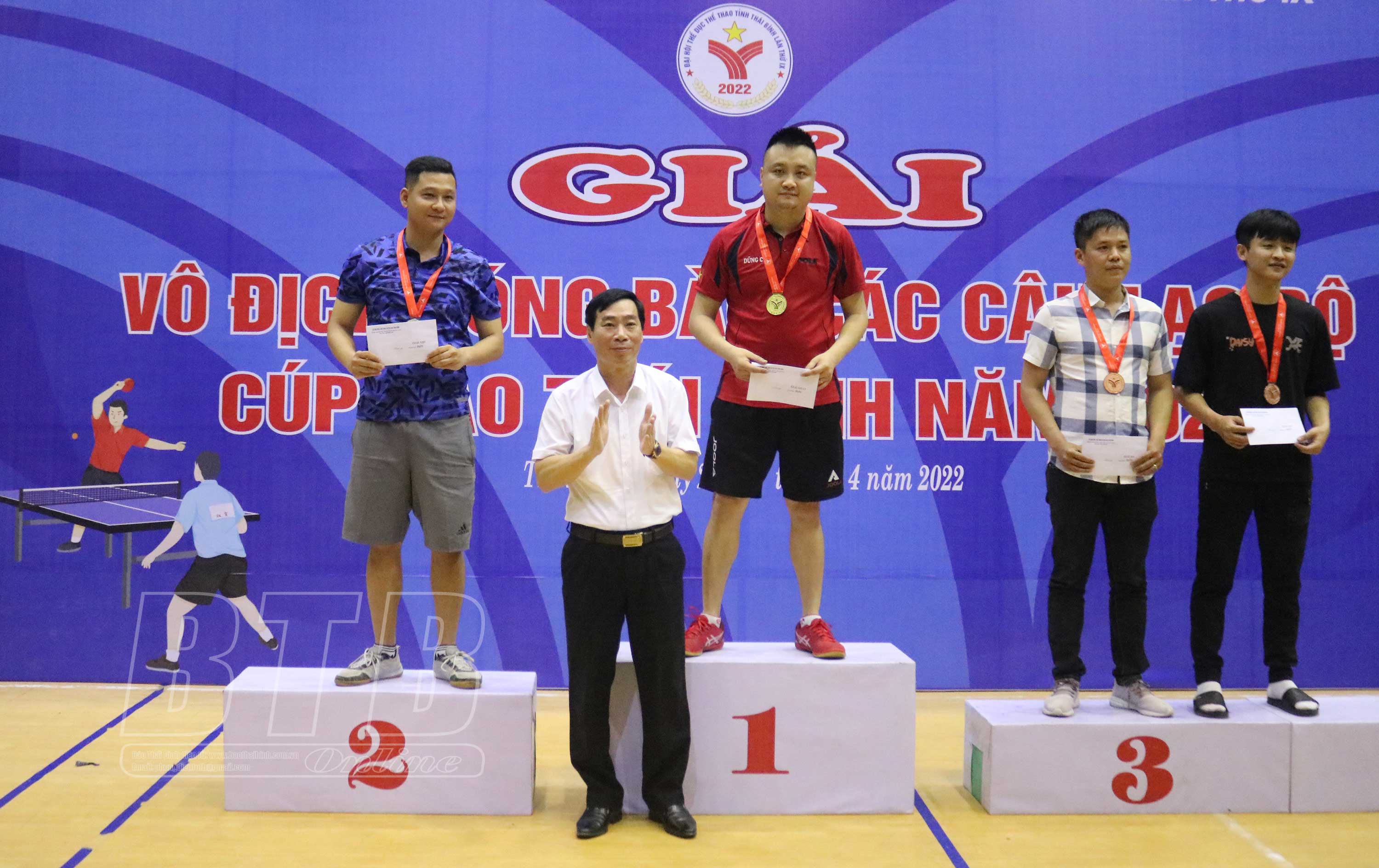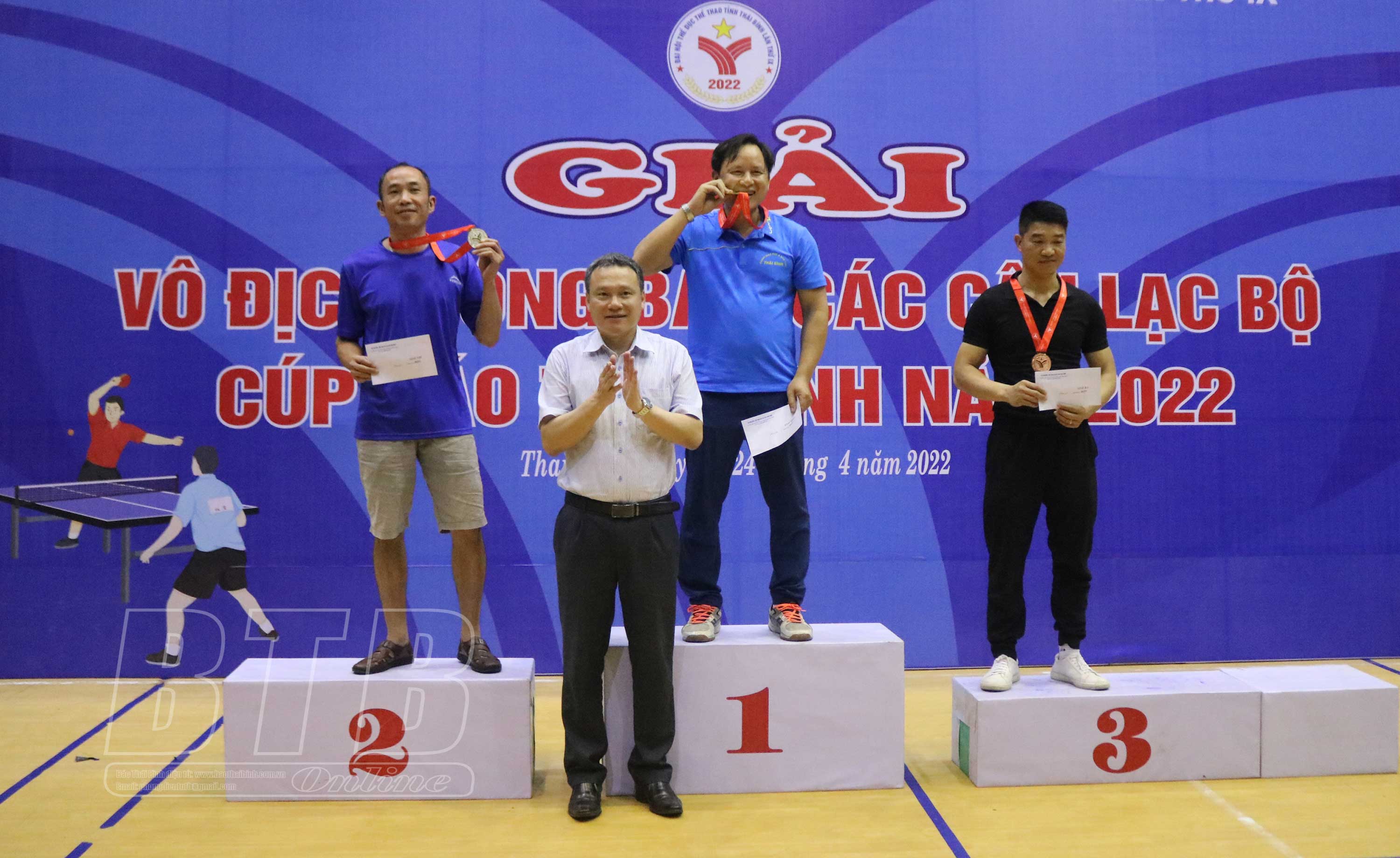 Đồng chí Hoàng Minh Sơn, Tổng biên tập Báo Thái Bình, Chủ tịch Hội Nhà báo Thái Bình trao giải cho các đội đạt giải đơn nam ở độ tuổi 36-45 tuổi.
