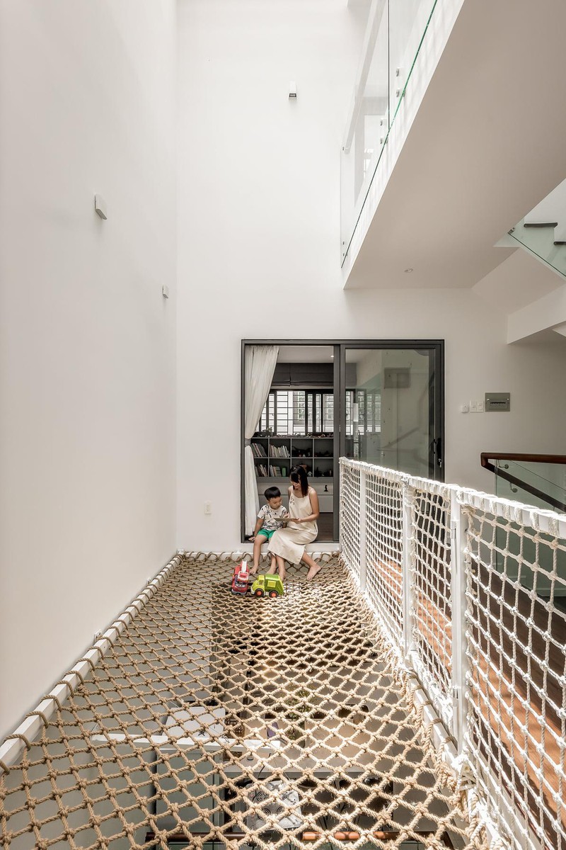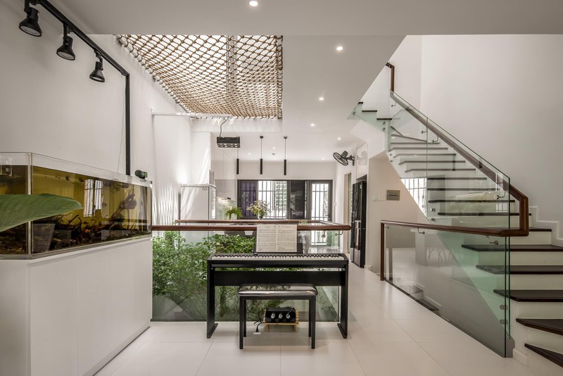 Một khoảng trống lớn được đưa ra giữa nhà làm ống thông gió cho mọi không gian. Ánh sáng mặt trời và gió có thể vào nhờ mái kính và cửa gió bằng nhôm trên đỉnh mái. Hai khu vườn nhỏ ở giữa và sau tầng trệt là không gian xanh cho ngôi nhà này.