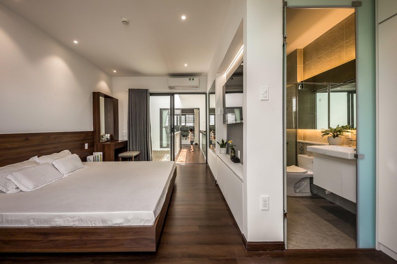 Phòng ngủ với phòng tắm hạng 5 sao, dùng vách kính ngăn hiện đại. Do nằm cạnh giếng trời nên không gian bên trong luôn thông thoáng, dễ chịu nhưng ánh sáng cũng không bị quá gắt.
