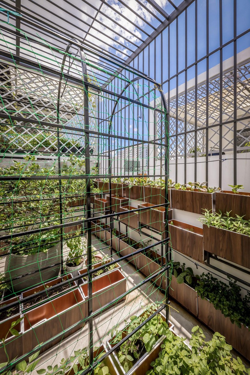 Vườn trong phố, đủ cây cảnh, rau xanh, giàn leo... cung cấp rau sạch quanh năm cho cả nhà.