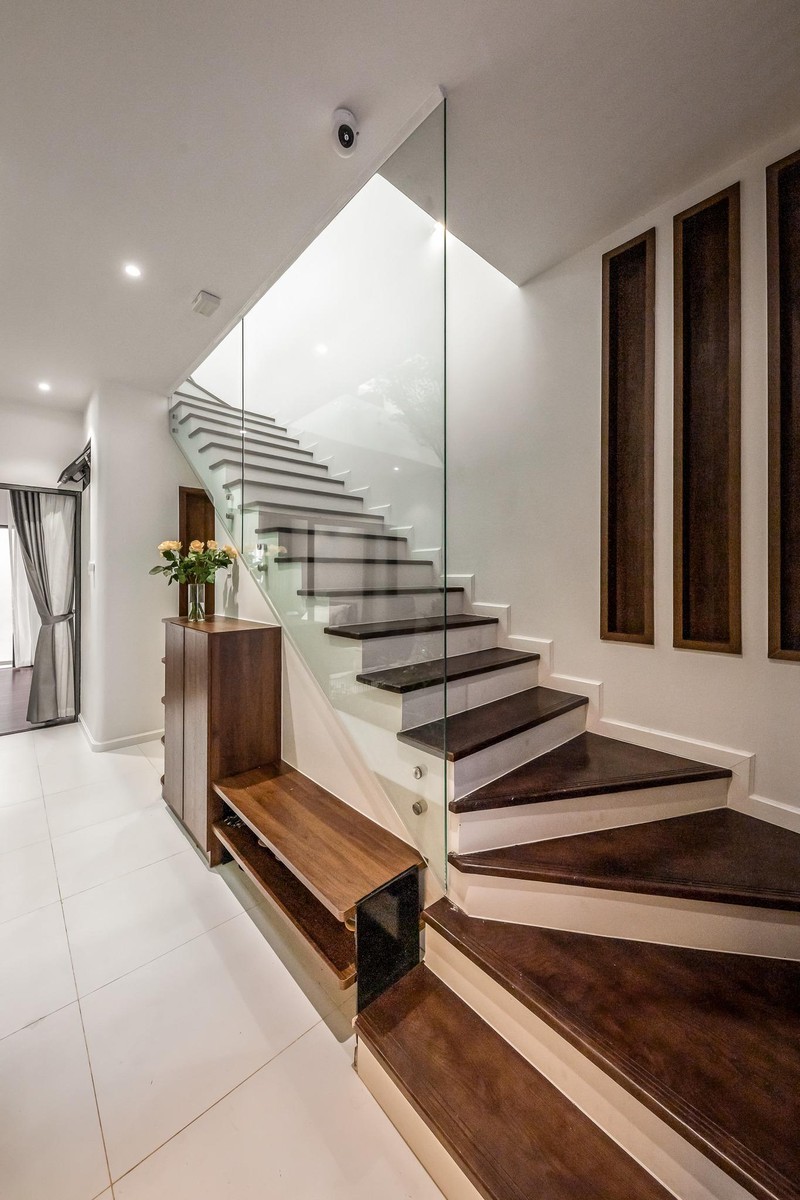 Cầu thang ốp gỗ ấm áp, dễ chịu. Kiến trúc sư không dùng tay vịn như thông thường mà dùng vách kính đảm bảo an toàn, đồng thời tạo không gian mở cho nhà.