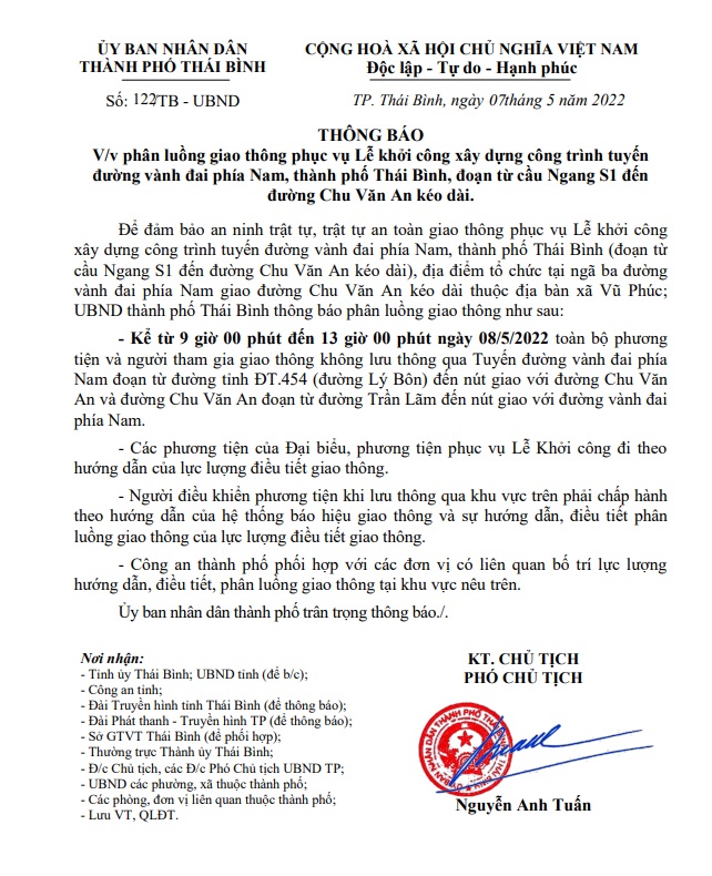 Ngày 07/5/2022, UBND thành phố Thái Bình có thông báo số 122/TB - UBND về việc phân luồng giao thông phục vụ lễ khởi công xây dựng công trình tuyến đường vành đai phía Nam, thành phố Thái Bình, đoạn từ cầu Ngang S1 đến đường Chu Văn An kéo dài.