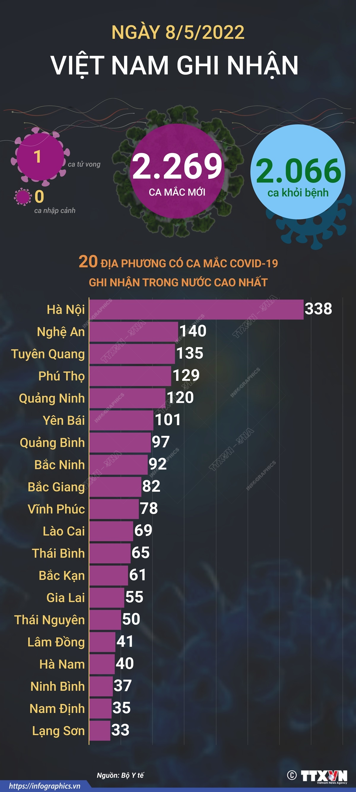 Theo Bộ Y tế, tính từ 16h ngày 7/5 đến 16h ngày 8/5/2022, Việt Nam ghi nhận 2.269 ca mắc mới COVID-19 tại 51tỉnh, thành phố
