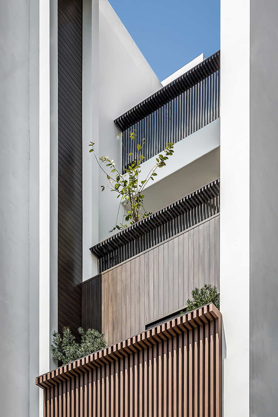 Các kiến trúc sư đã bàn với gia chủ, lựa chọn giải pháp các tầng giật cấp. Tầng trệt xây hết diện tích, tầng một và hai giật lùi vào trong khiến khu vực hứng nắng ngày càng rộng, dẫn ánh sáng vào sâu bên trong cho không gian các tầng phía dưới. Giải pháp này còn giúp các phòng phía trước mở rộng góc nhìn, căn nhà trở nên thanh thoát, không bị ngộp.