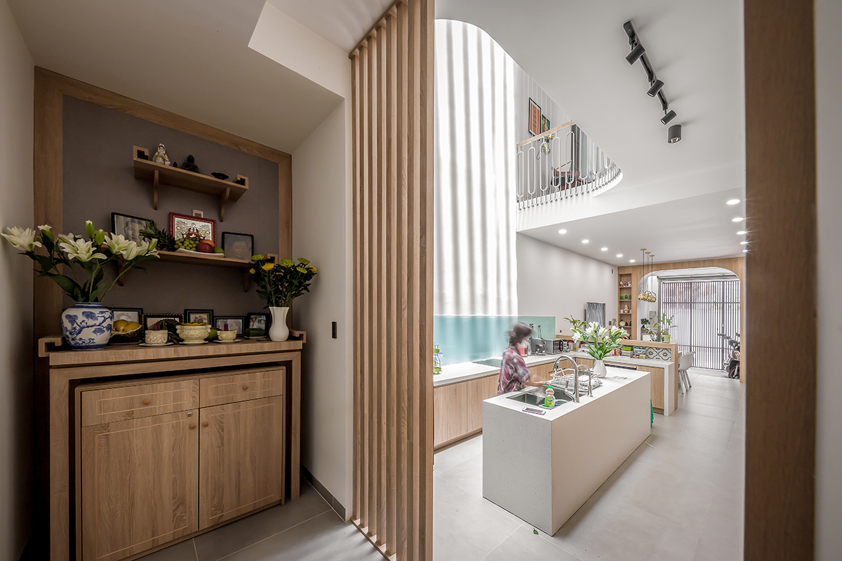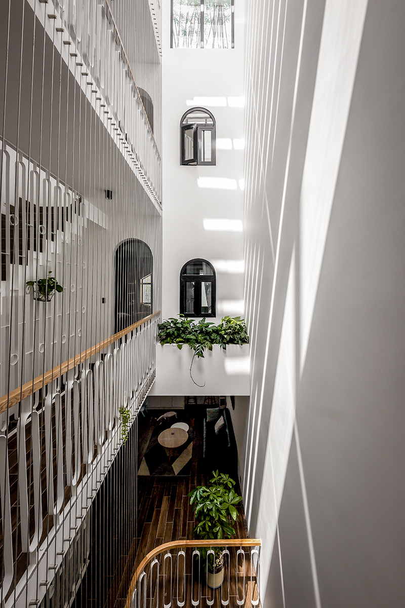 Giếng trời này cũng giúp các tầng phía trên được kết nối với nhau, nhờ đó các thành viên trong gia đình có thể nhìn thấy, giao tiếp dễ dàng.