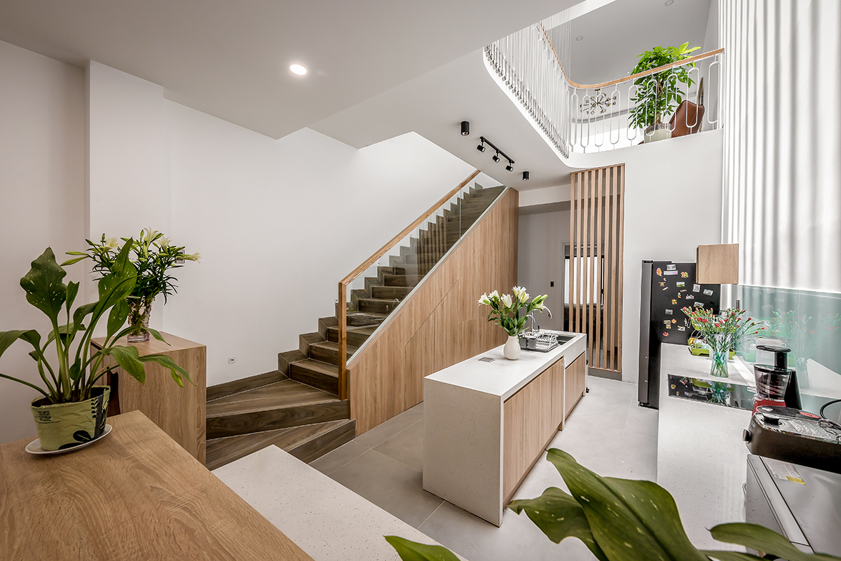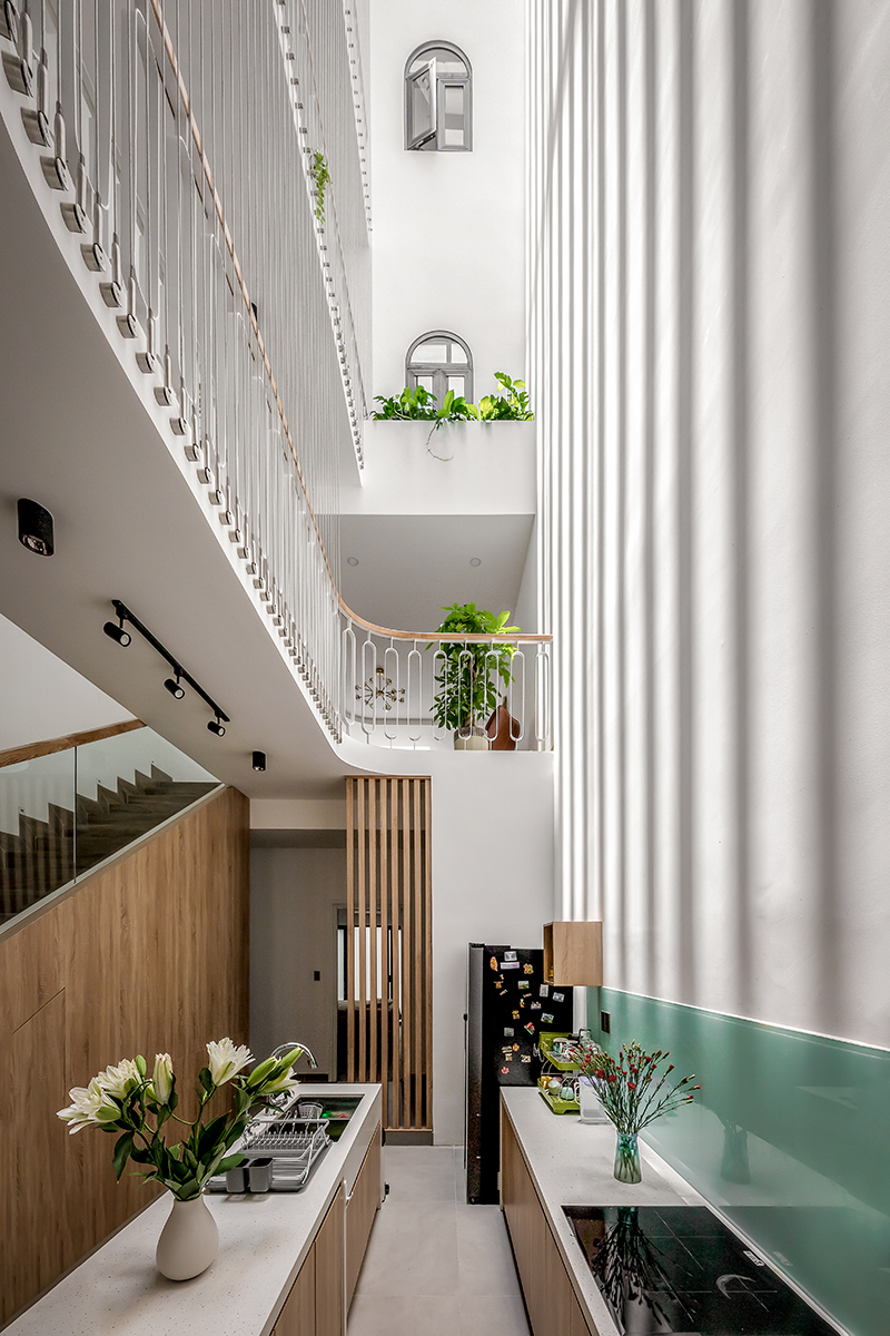 Nhưng chỉ riêng giải pháp ban công giật cấp là chưa đủ. Để trong lòng nhà sáng hơn, một giếng trời lớn thông suốt cả ba tầng, đưa ánh sáng xuống tận mặt bếp để khu vực này luôn khô ráo.