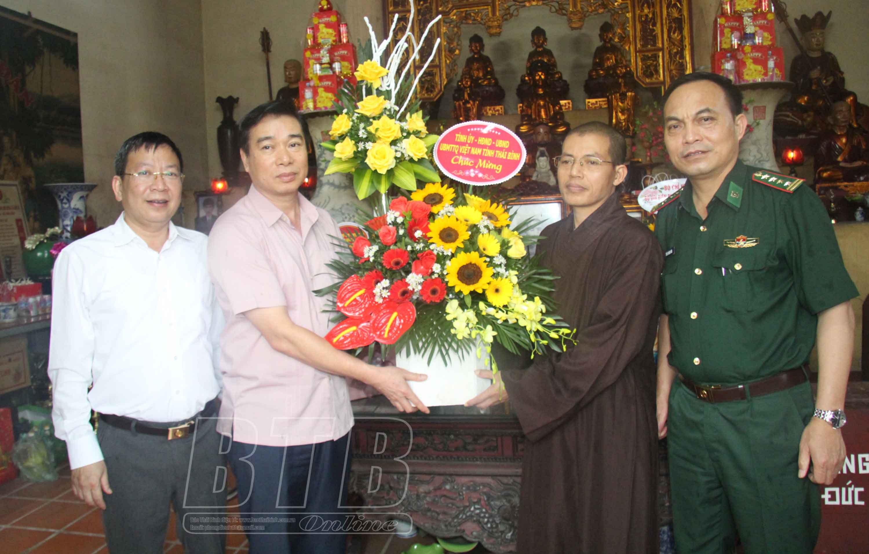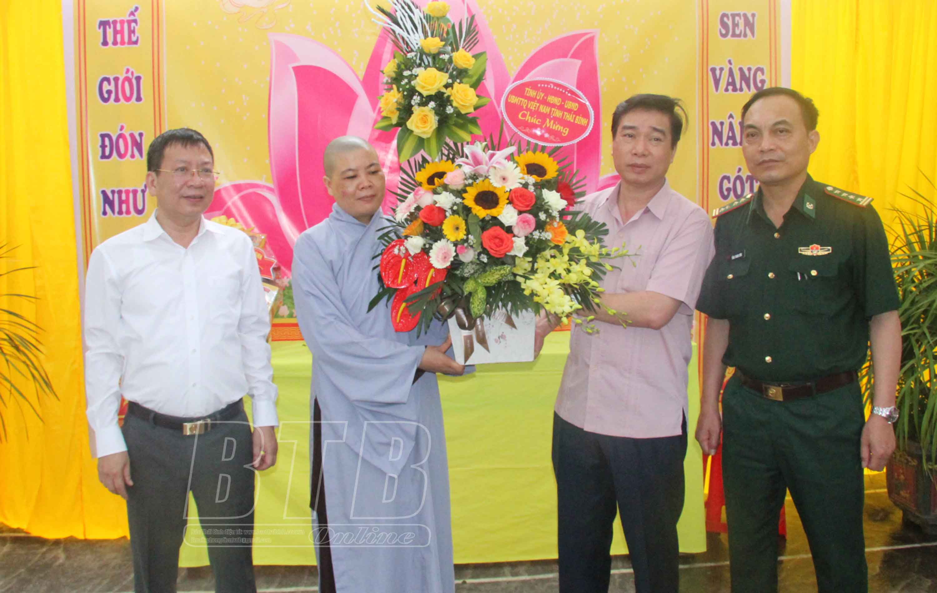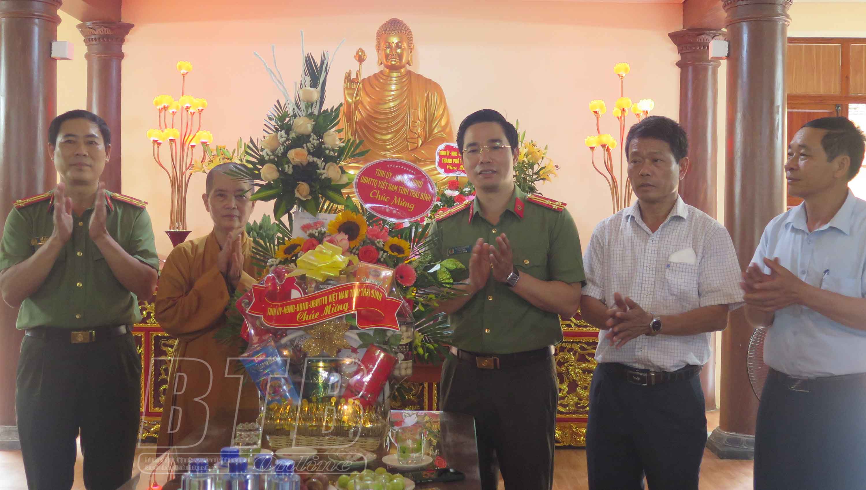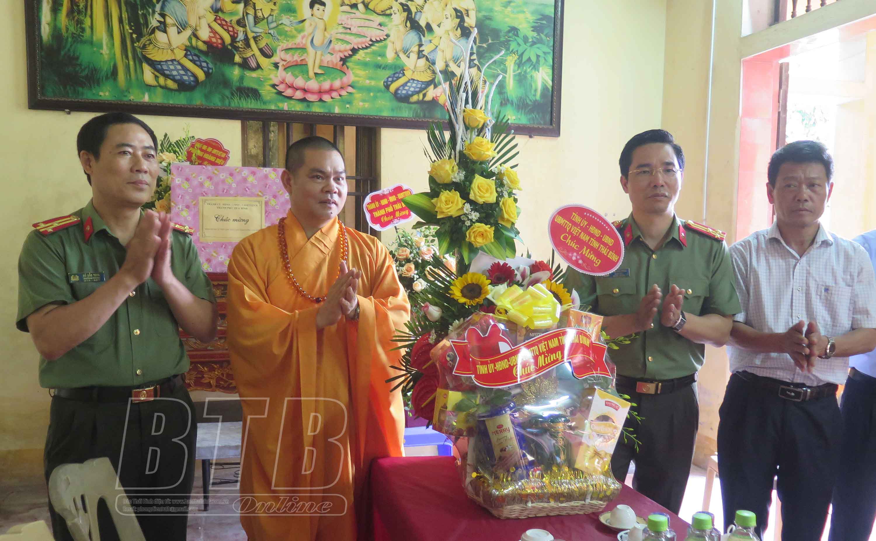 * Tại thành phố Thái Bình, các đồng chí: Thượng tá Trần Văn Phúc, Ủy viên Ban Thường vụ Tỉnh ủy, Giám đốc Công an tỉnh; Hoàng Văn Thành, Ủy viên Ban Thường vụ Tỉnh ủy, Bí thư Thành ủy, Chủ tịch HĐND thành phố Thái Bình; lãnh đạo Ban Dân vận Tỉnh ủy đã đến thăm, chúc mừng Thượng tọa Thích Thanh Định, Ủy viên Hội đồng Trị sự Trung ương Giáo hội Phật giáo Việt Nam, Phó Trưởng ban thường trực Ban Trị sự Giáo hội Phật giáo Việt Nam tỉnh, trụ trì chùa Từ Xuyên, phường Hoàng Diệu; Thượng tọa Thích Trí Sử, Ủy viên Thường trực Ban Trị sự Giáo hội Phật giáo Việt Nam tỉnh, Trưởng ban Trị sự Giáo hội Phật giáo Việt Nam thành phố Thái Bình, trụ trì chùa Sùng Nghiêm, phường Hoàng Diệu; Ni trưởng Thích Đàm Thoa, Ủy viên thường trực Ban Trị sự Giáo hội Phật giáo Việt Nam tỉnh, Phó ban Trị sự Giáo hội Phật giáo Việt Nam tỉnh, trụ trì chùa Viên Quang, phường Trần Lãm.