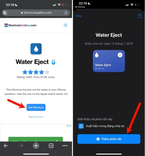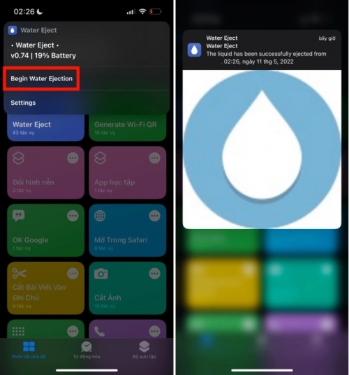 Sau khi hoàn tất, tùy chọn Water Eject sẽ xuất hiện trong mục Phím tắt của tôi. Nếu muốn kích hoạt nhanh hơn, người dùng có thể thêm widget lên màn hình chính, hoặc thiết lập để ra lệnh bằng giọng nói thông qua trợ lý ảo Siri.