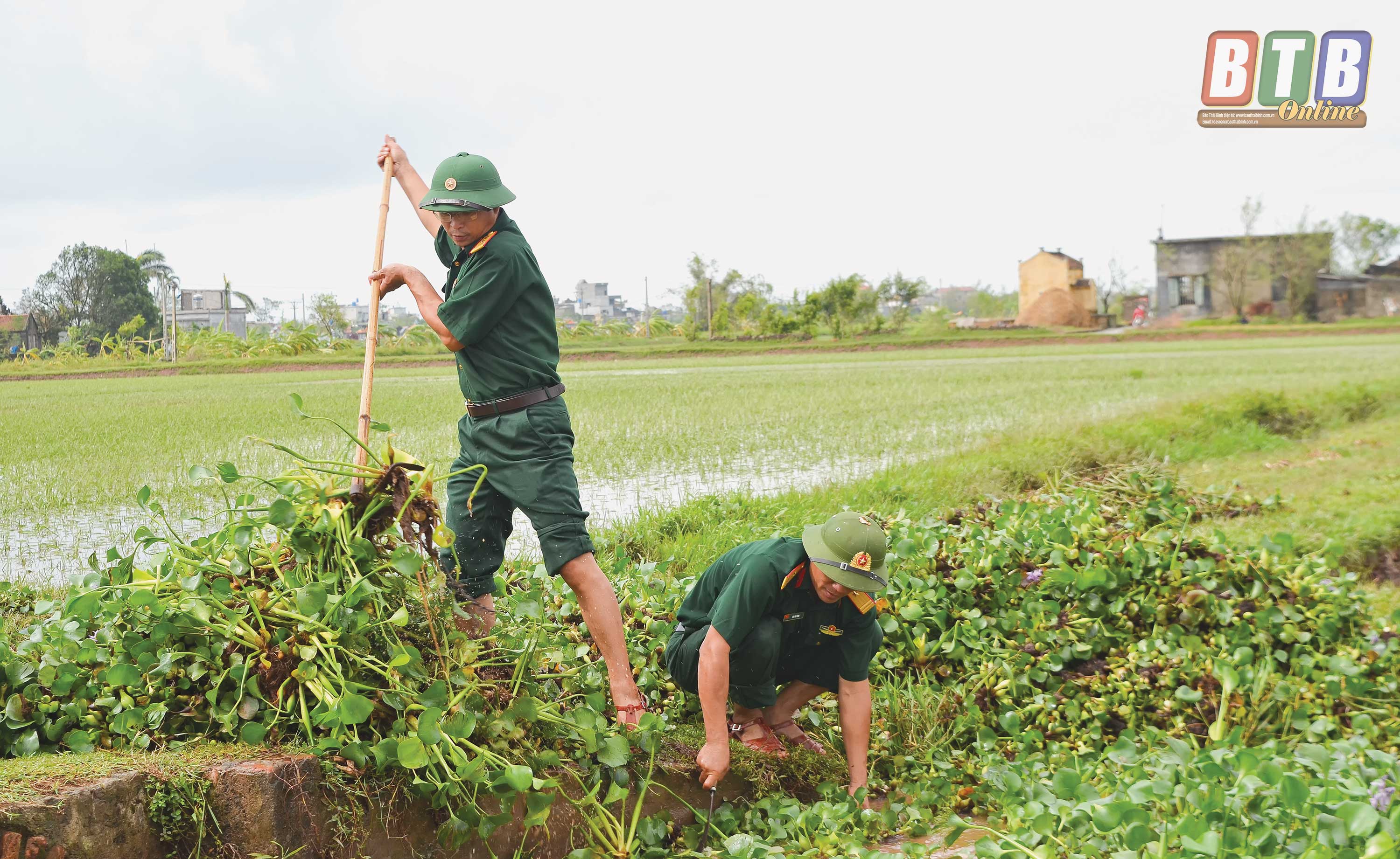 Lực lượng vũ trang huyện Tiền Hải tham gia vớt bèo bồng, khơi thông dòng chảy.