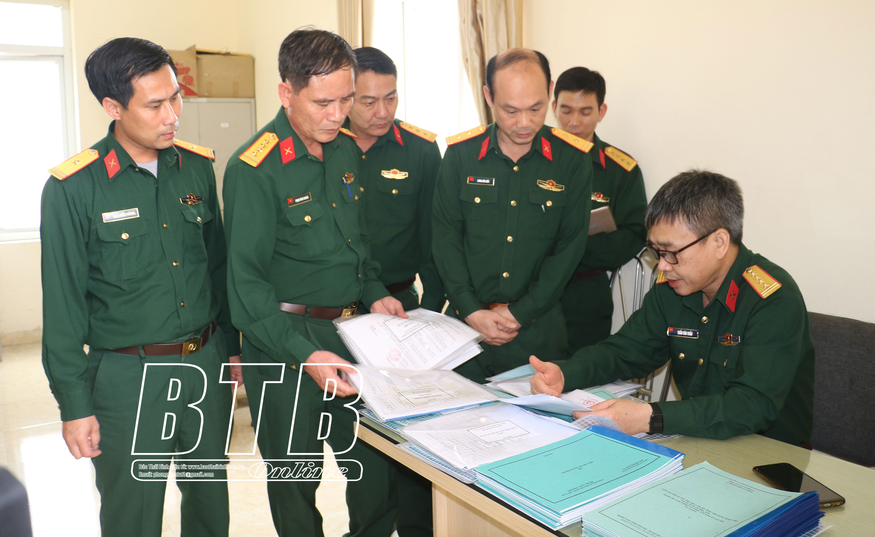 Thành viên đoàn kiểm tra của Cục Dân quân Tự vệ kiểm tra sổ sách quản lý dân quân tự vệ tại Ban CHQS thành phố Thái Bình.