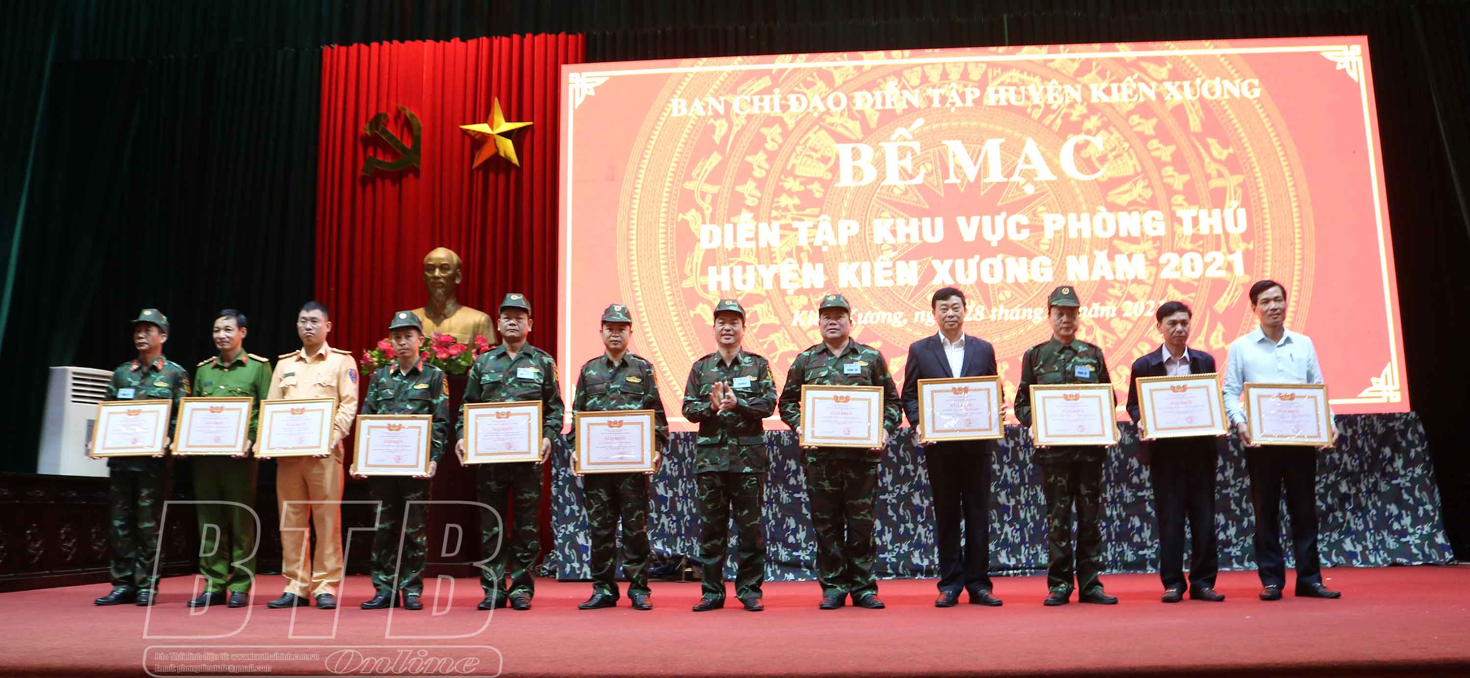 Nhân dịp này, UBND tỉnh, UBND huyện Kiến Xương đã tặng bằng khen, giấy khen cho các tập thể, cá nhân có thành tích xuất sắc trong tham gia diễn tập KVPT huyện năm 2021.