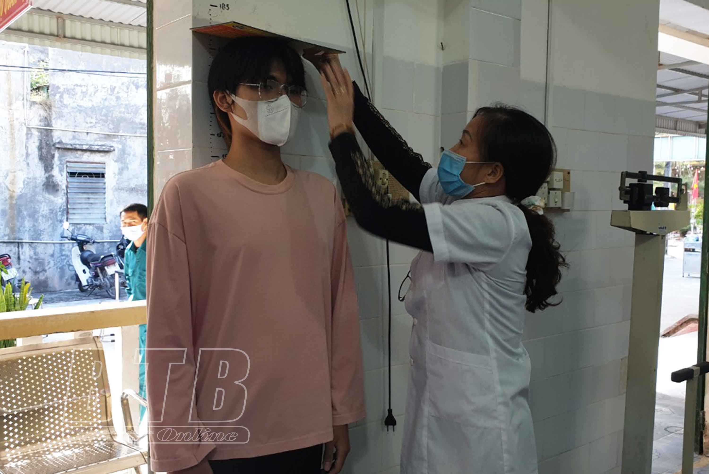 Đo chiều cao cho các công dân khám sơ tuyển.