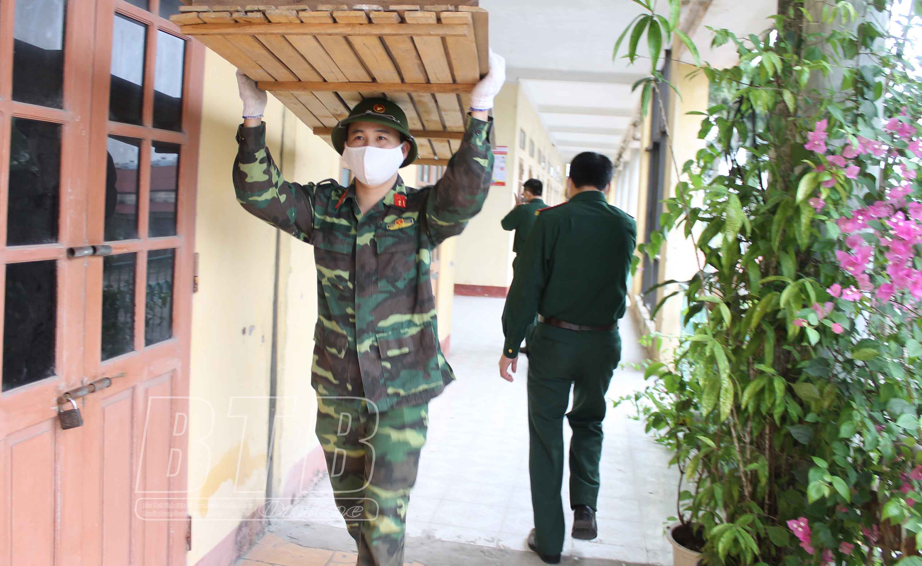 Cán bộ, chiến sĩ Ban CHQS huyện Vũ Thư chuẩn bị cơ sở vật chất khu cách ly y tế tập trung của huyện, góp phần phòng, chống dịch Covid-19.