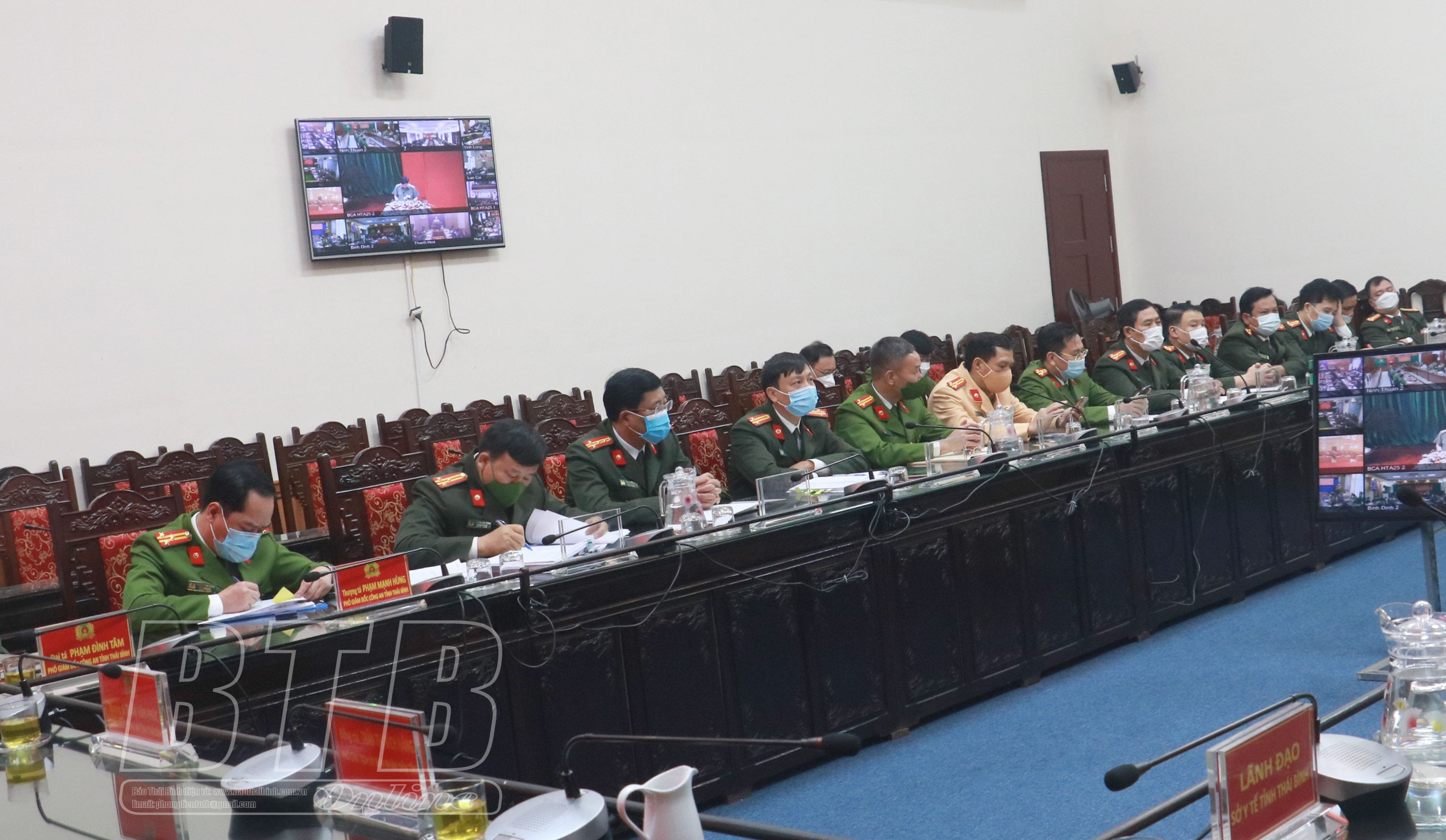 Thượng tá Trần Văn Phúc, Ủy viên Ban Thường vụ Tỉnh ủy, Giám đốc Công an tỉnh và đồng chí Trần Thị Bích Hằng, Tỉnh ủy viên, Phó Chủ tịch UBND tỉnh dự hội nghị tại điểm cầu Công an tỉnh.